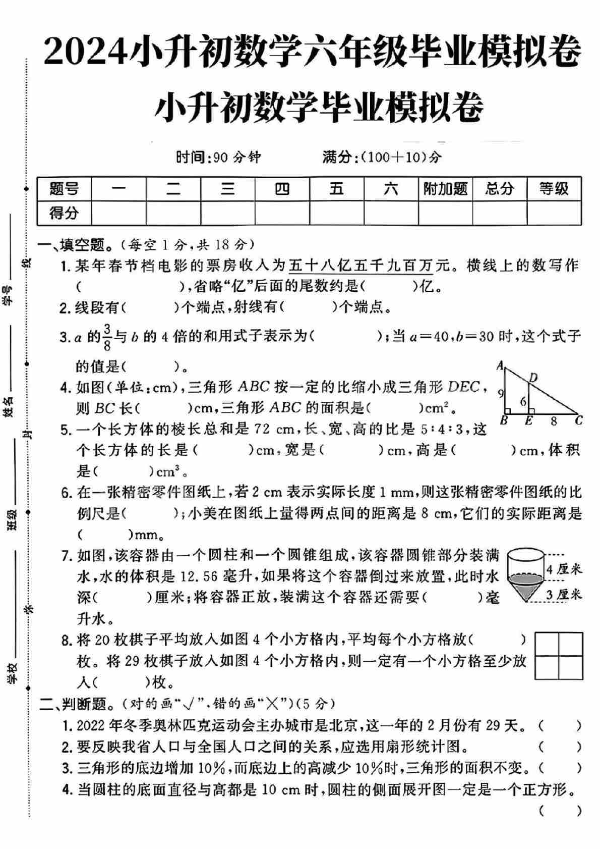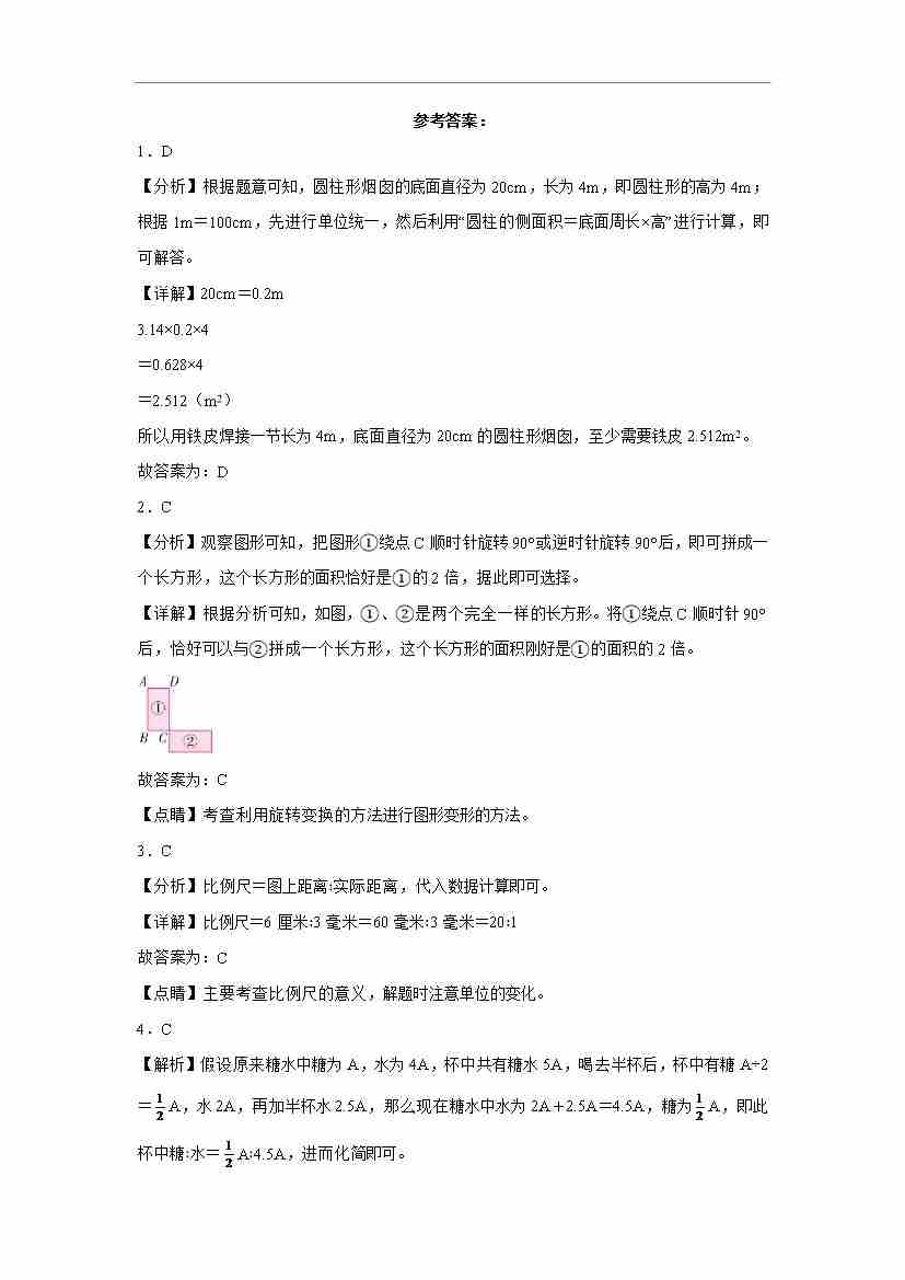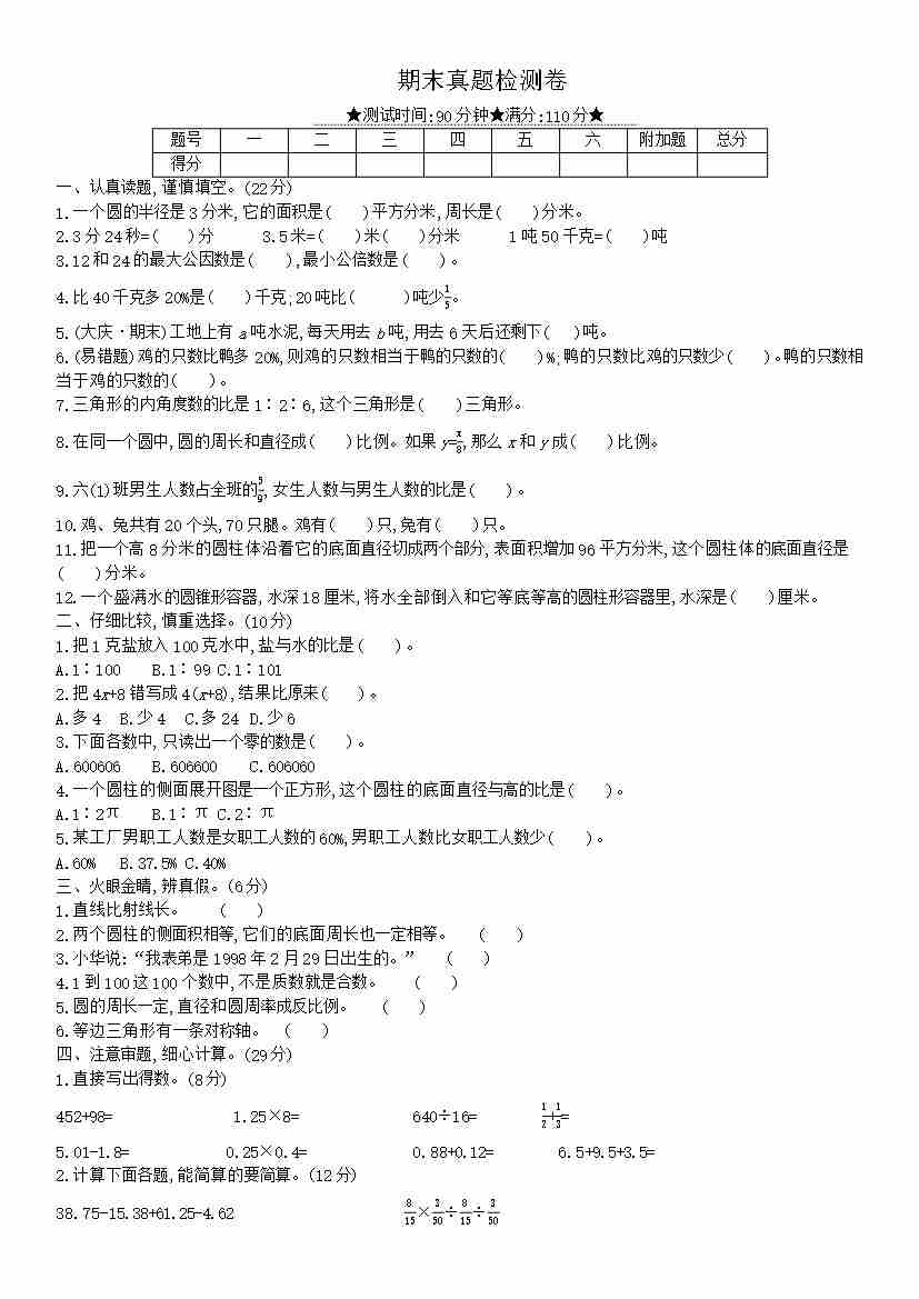六(下)数学北师版小升初择校分班考达标测试数学试卷答案