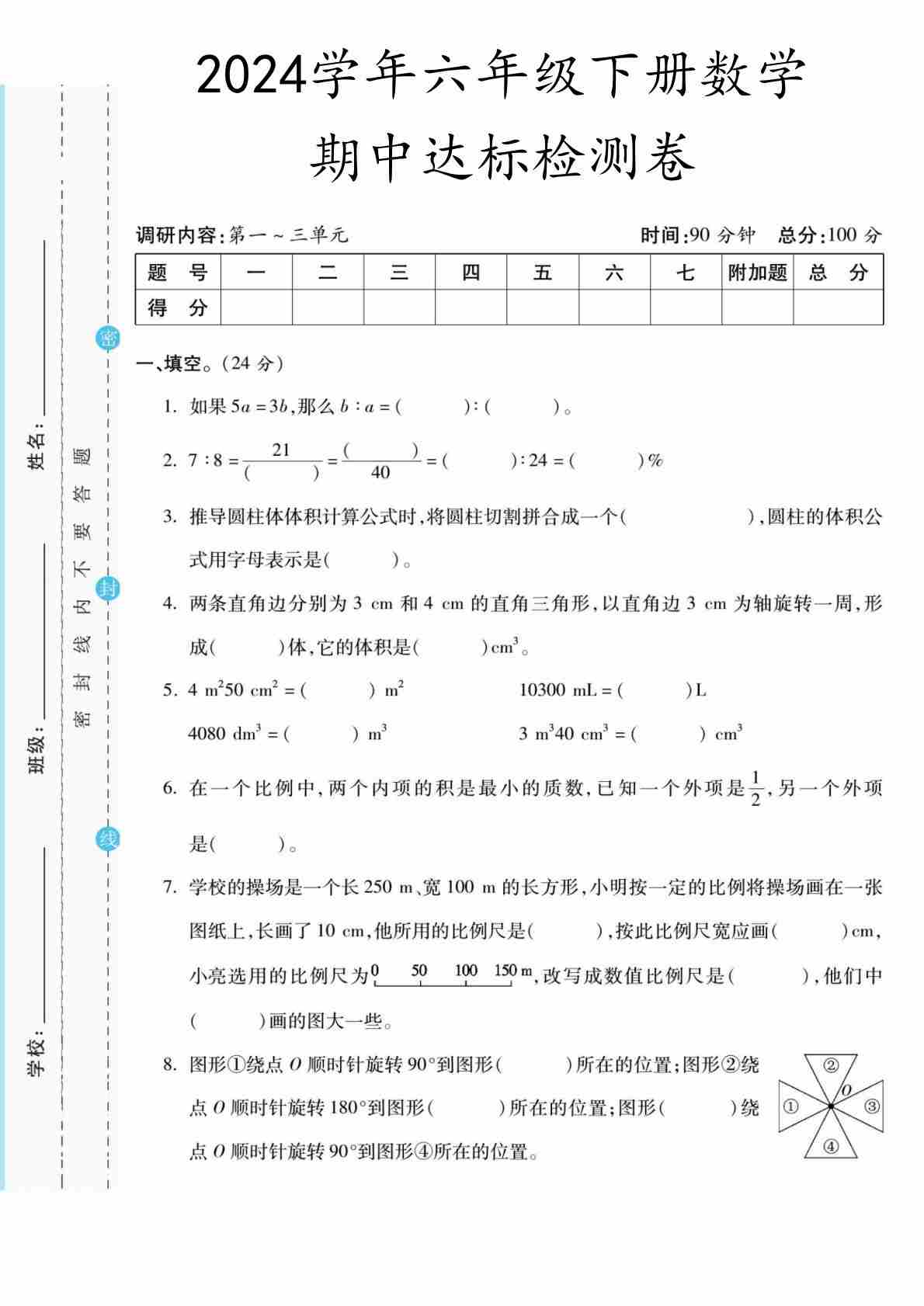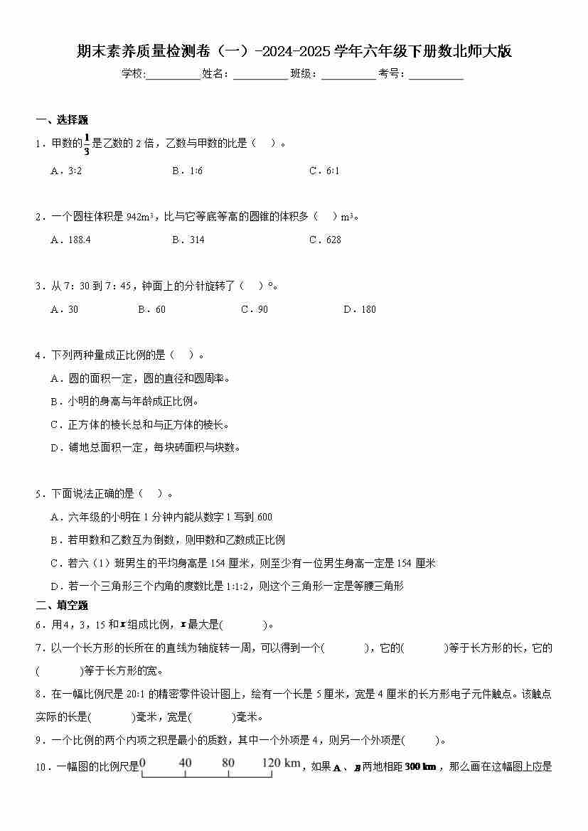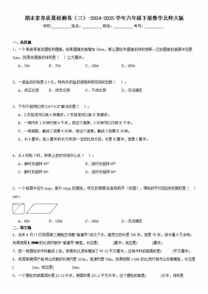 六下北师版数学【25春-期中测试卷(5套)】
