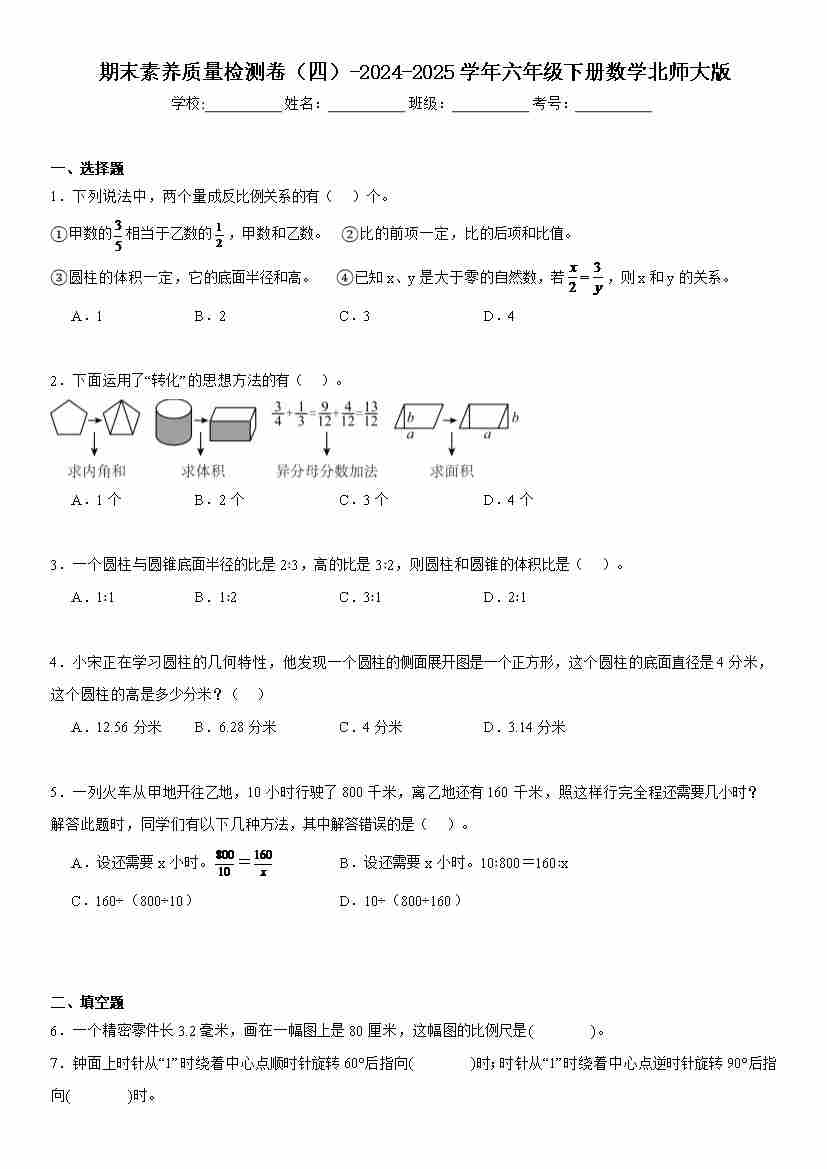 六(下)数学北师版【期末素养质量检测卷(四)(含解析)】