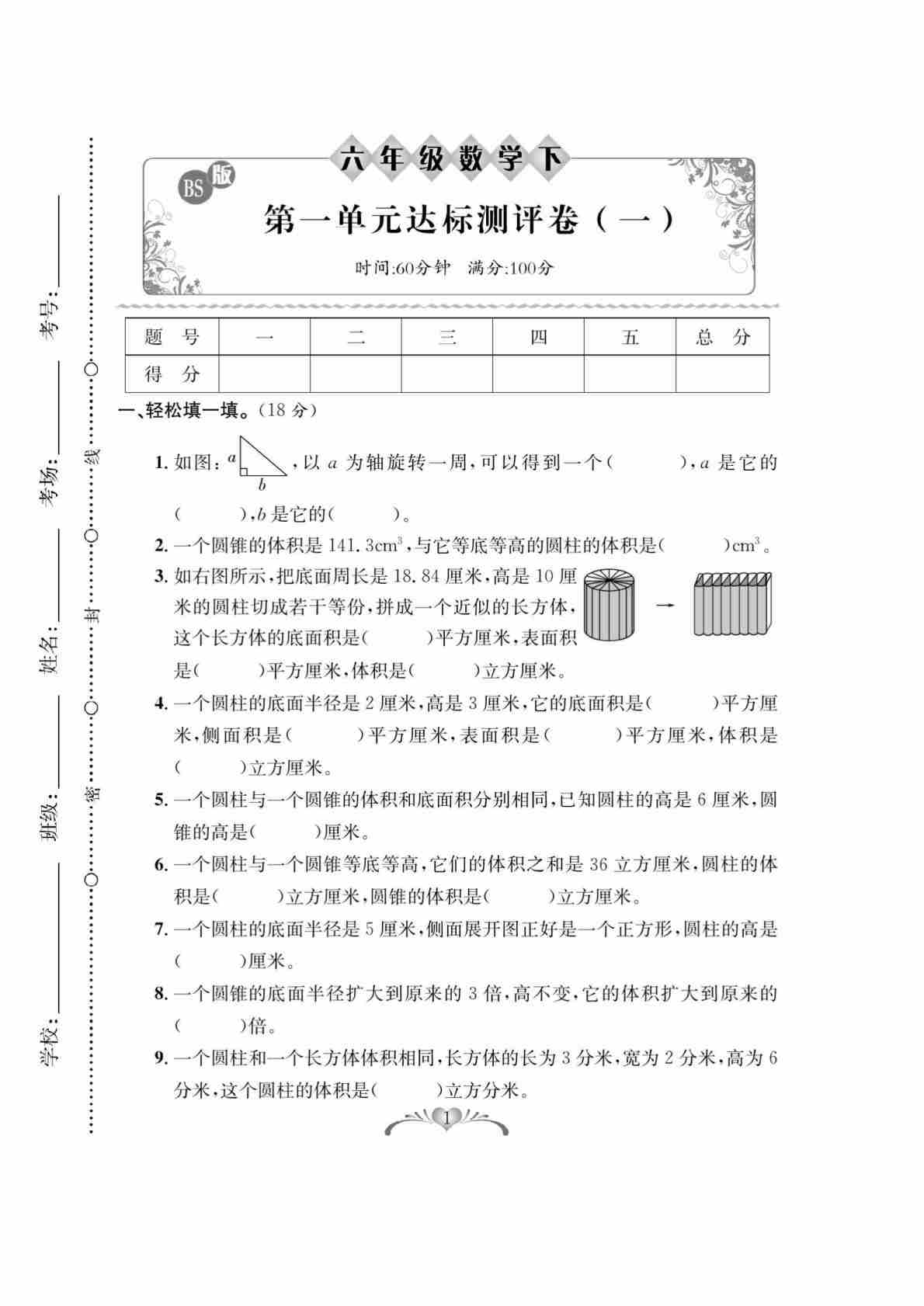六(下)数学试卷《百分好题卷》北师大A4版
