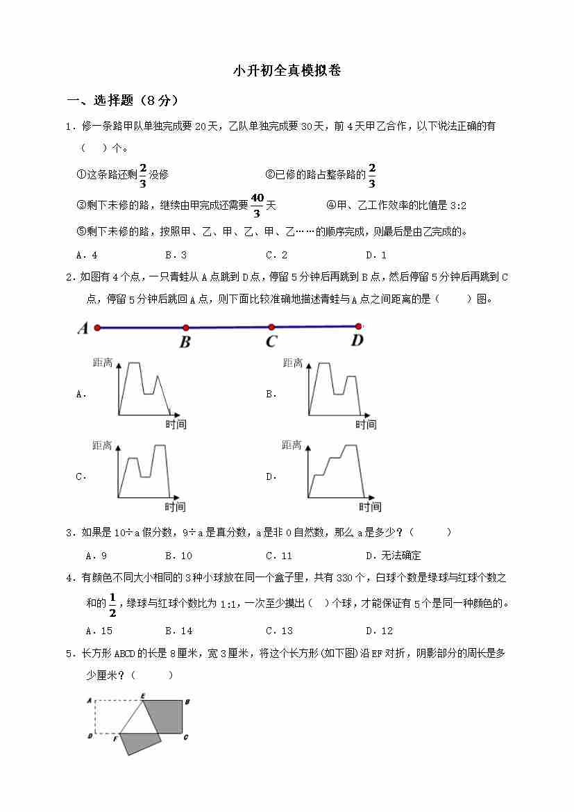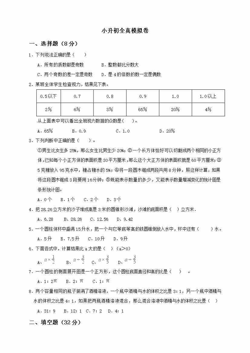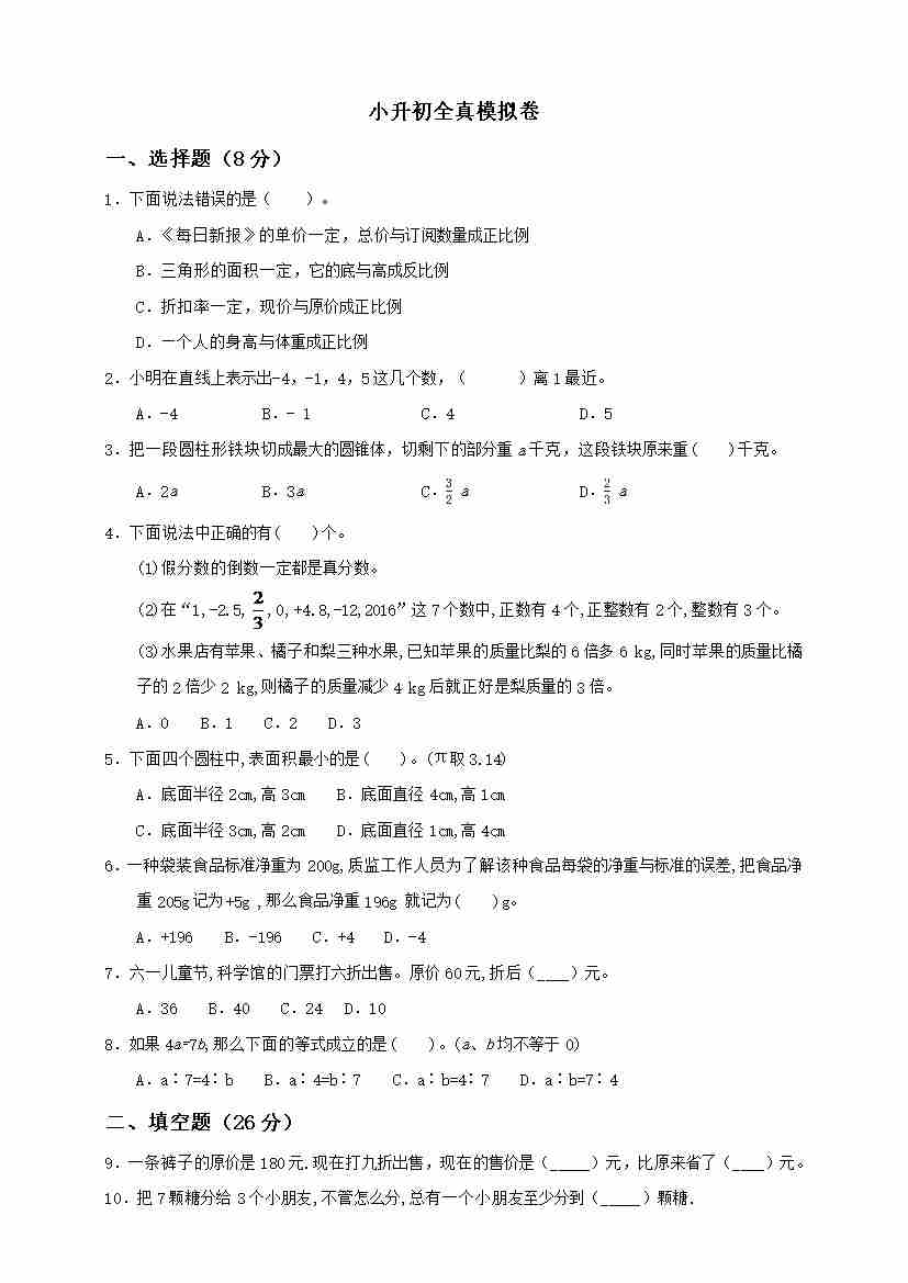 【备战小升初】六年级下册数学试题--小升初全真模拟卷(一)人教版 含答案