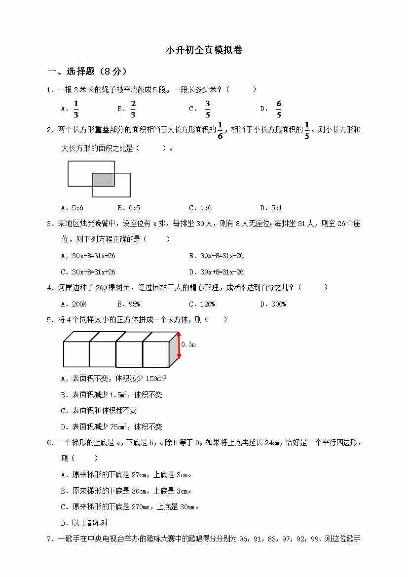 【备战小升初】六年级下册数学试题--小升初全真模拟卷(五)人教版 含答案