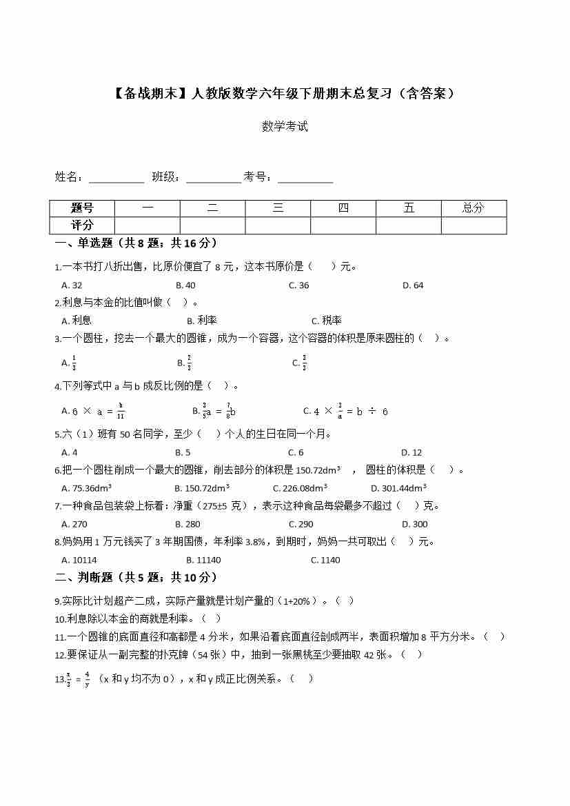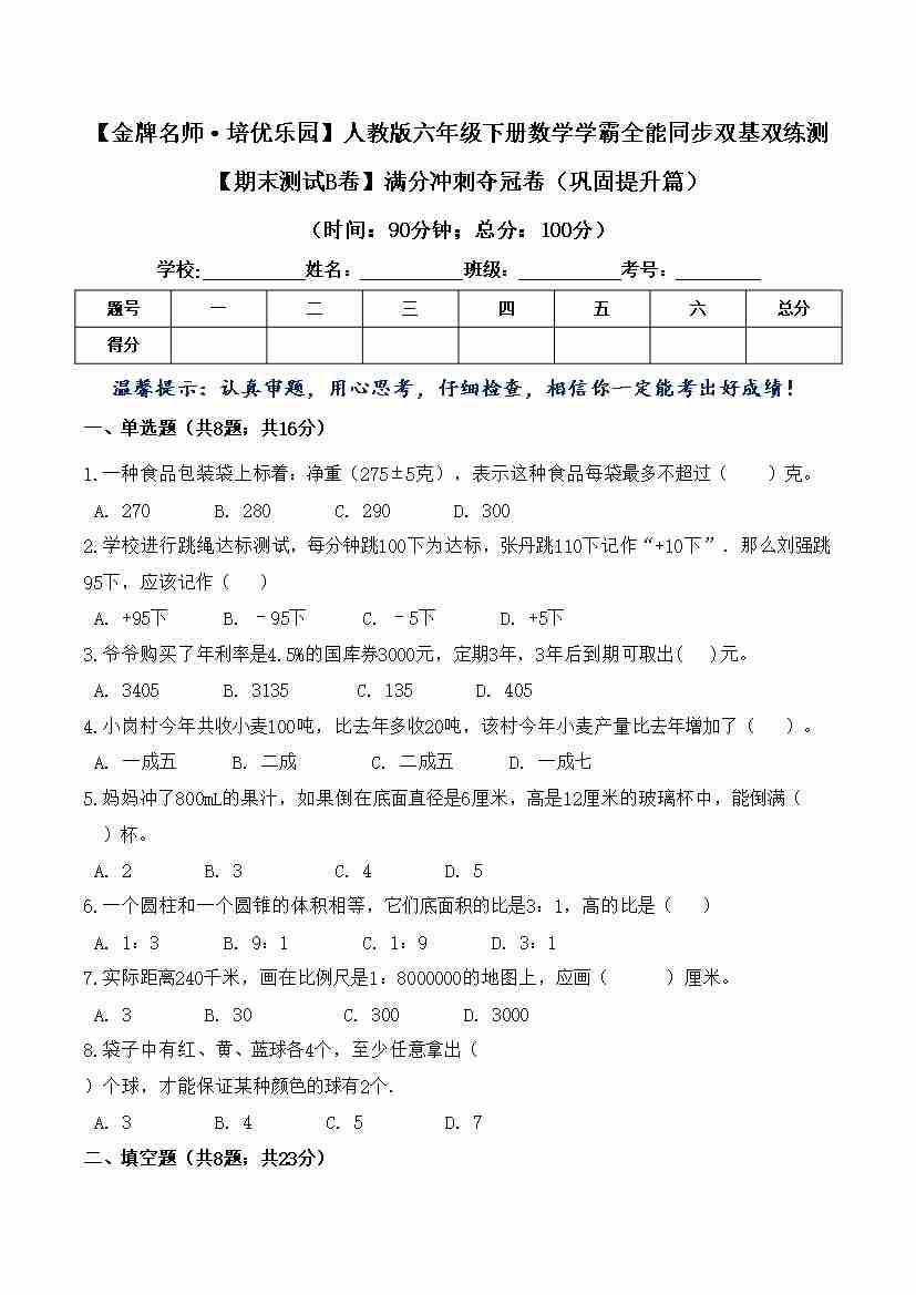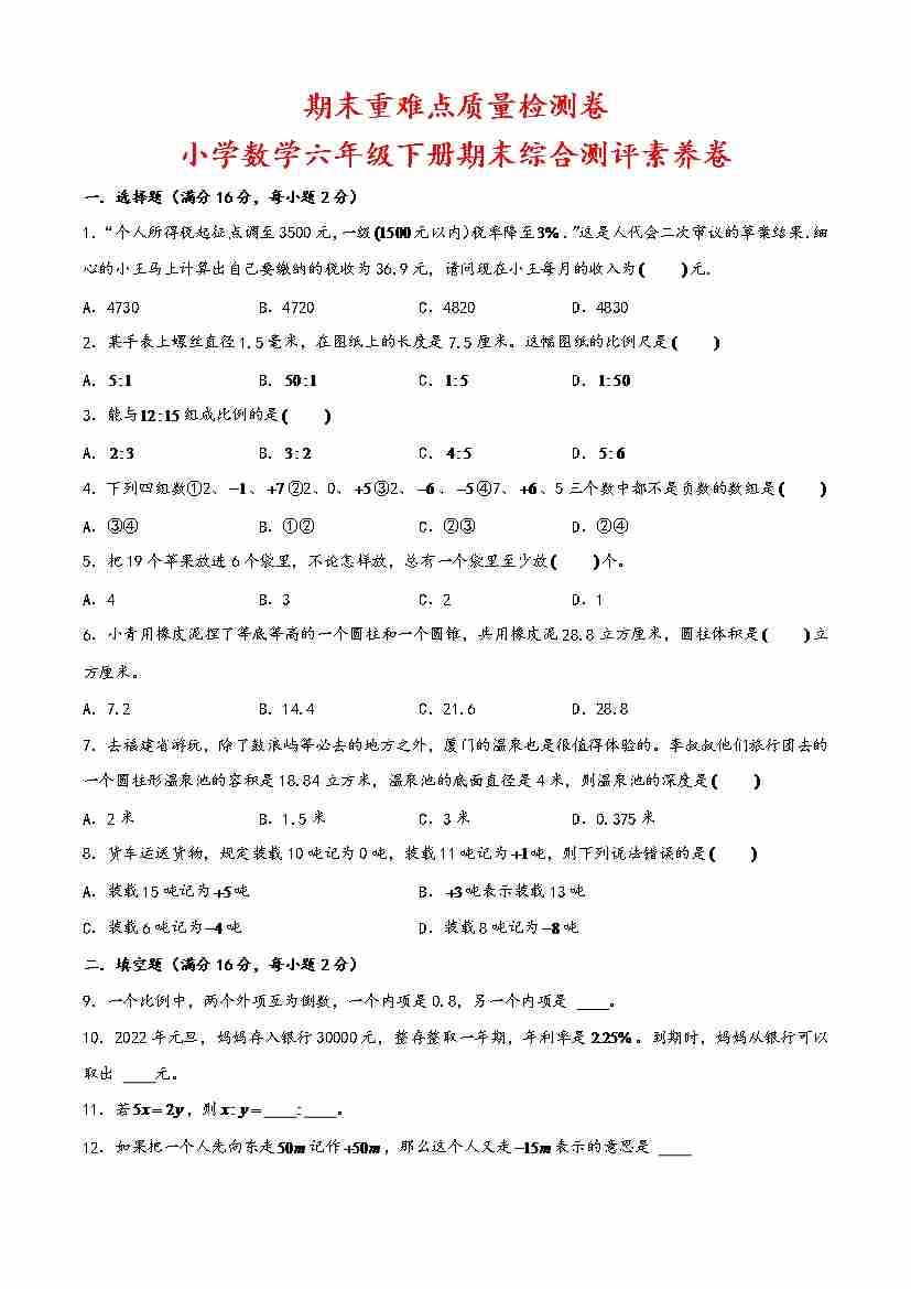 【备战期末提高卷】人教版数学六年级下册期末综合测试(一)(含答案)