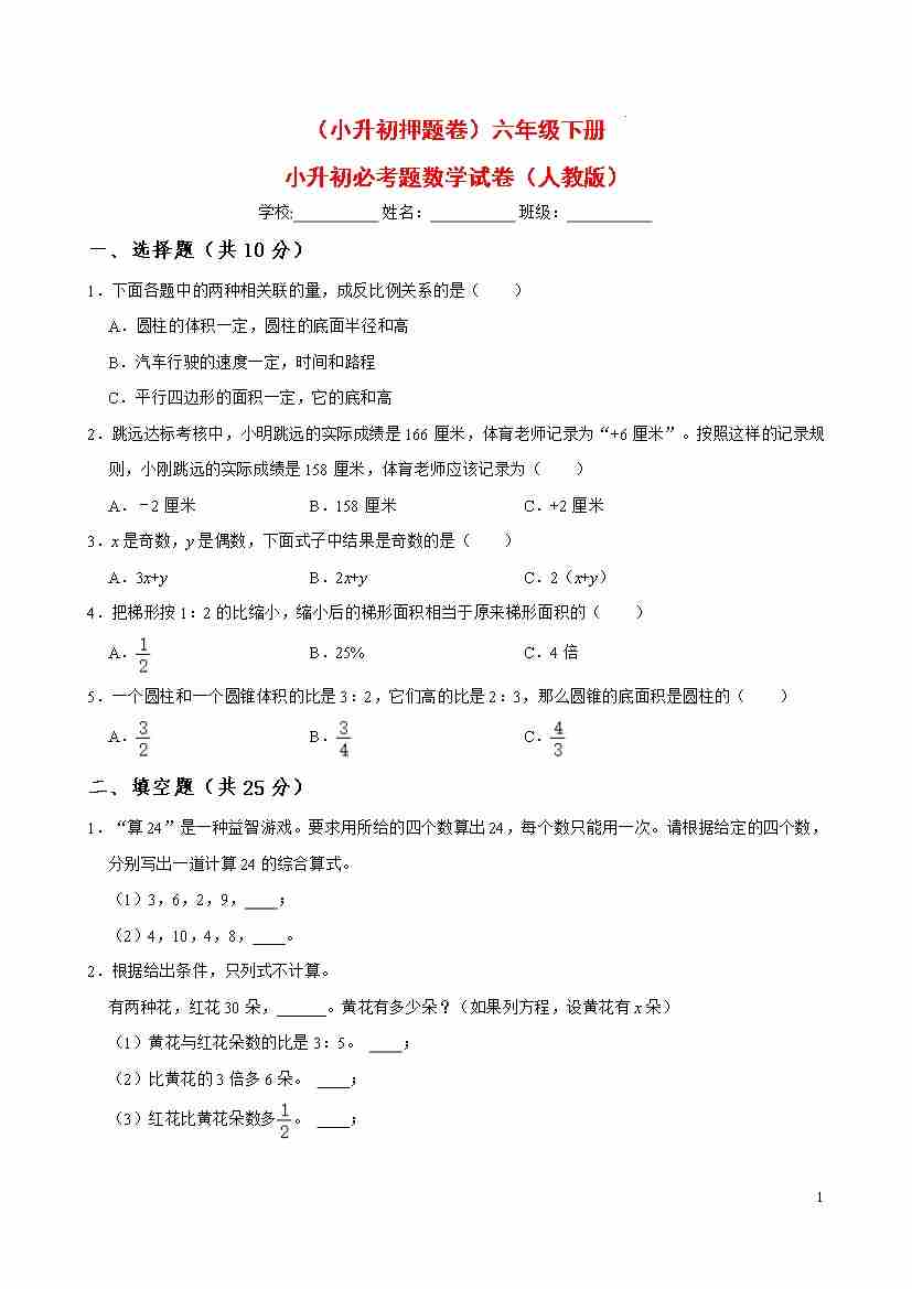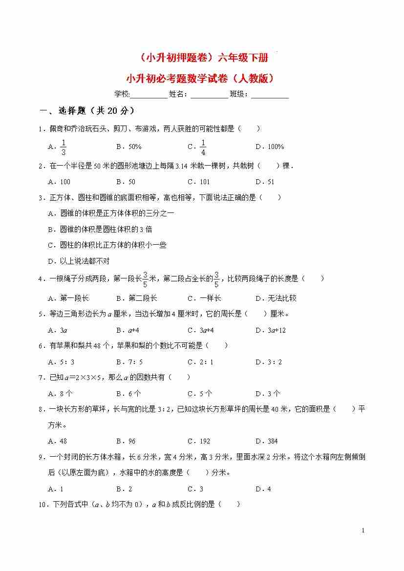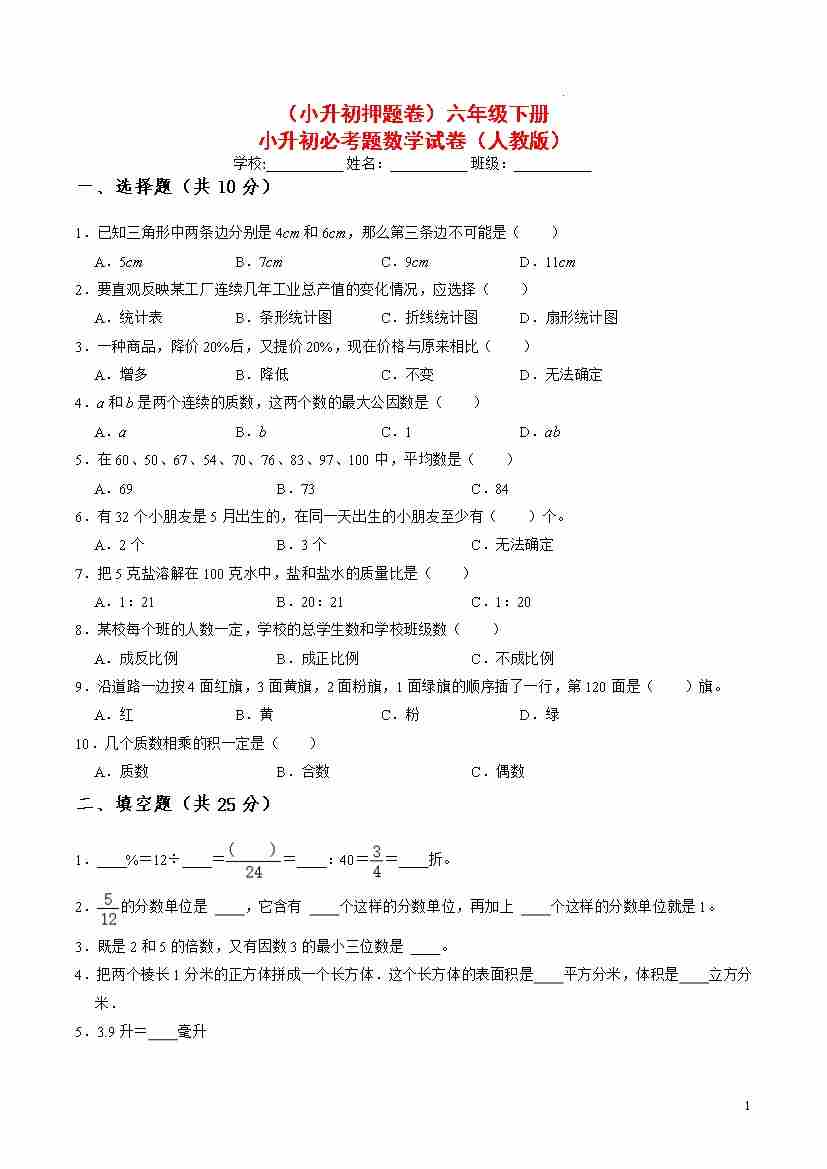 【小升初押题卷】六年级下册小升初必考题数学试卷(九)(人教版-含答案)