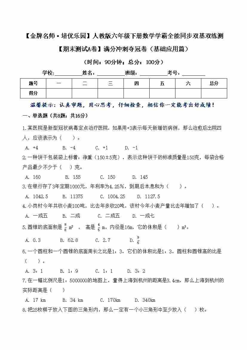 【满分冲刺夺冠卷】(基础应用篇)六年级下册数学学霸全能同步双基双练测 人教版(含答案)