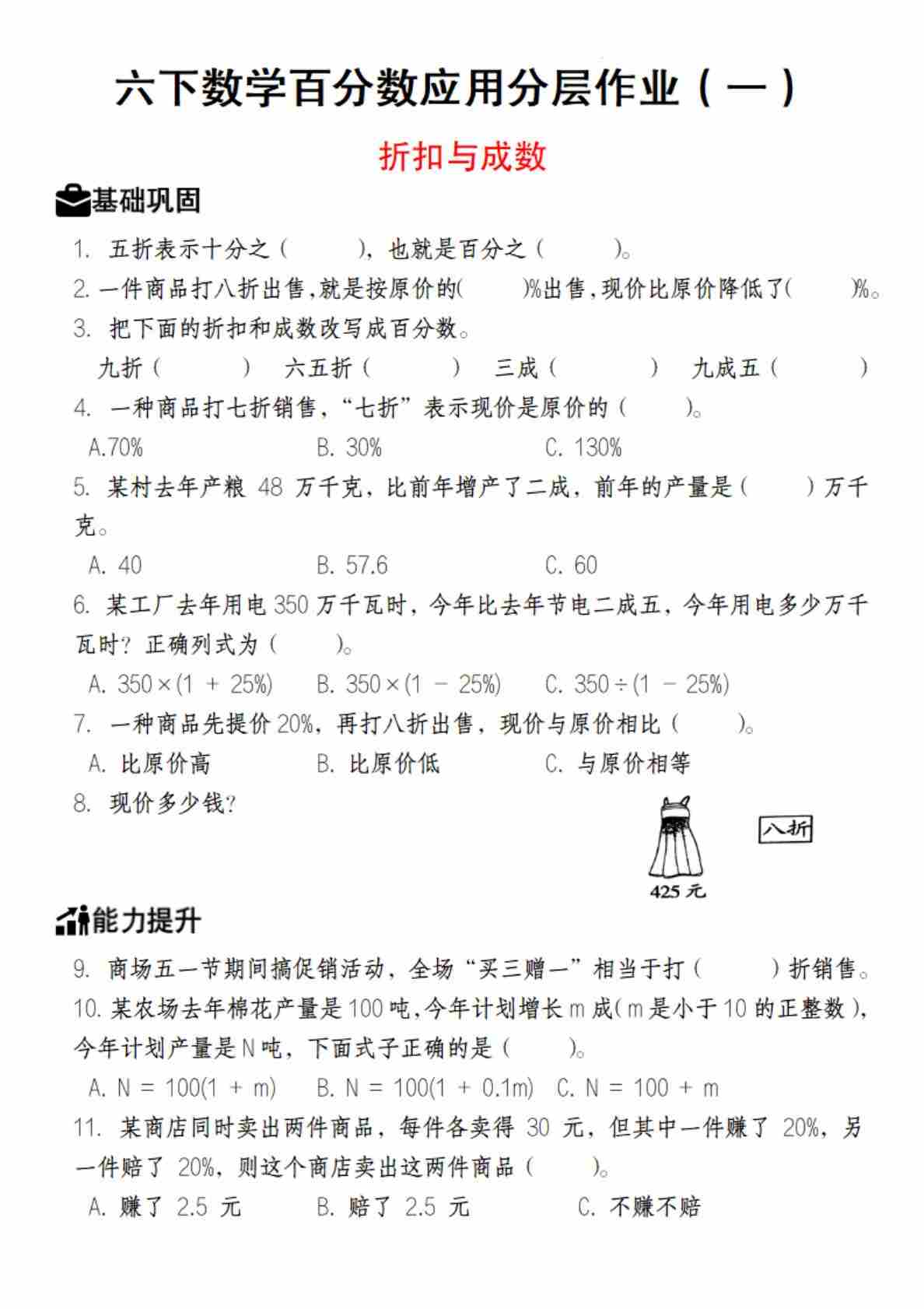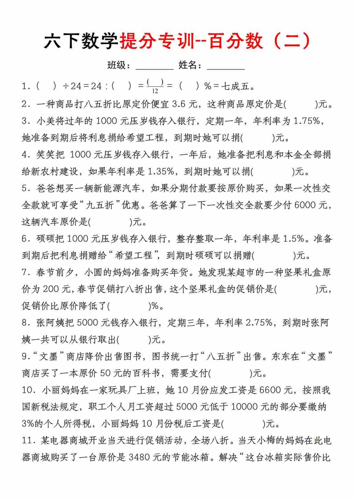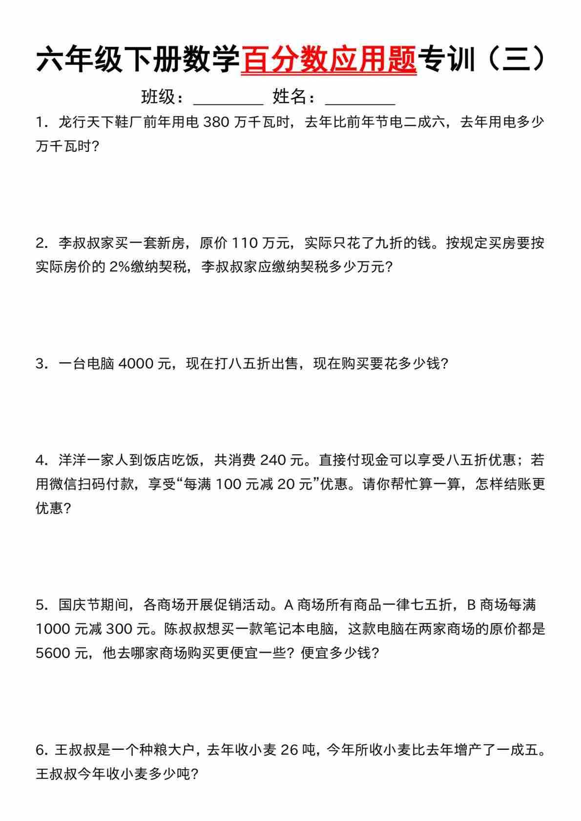 六下人教版数学【应用题-第二单元百分数专项(三)】