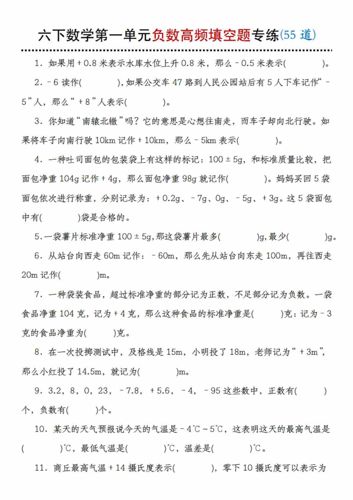 六下人教版数学【第一单元负数高频填空题专练(55道)】