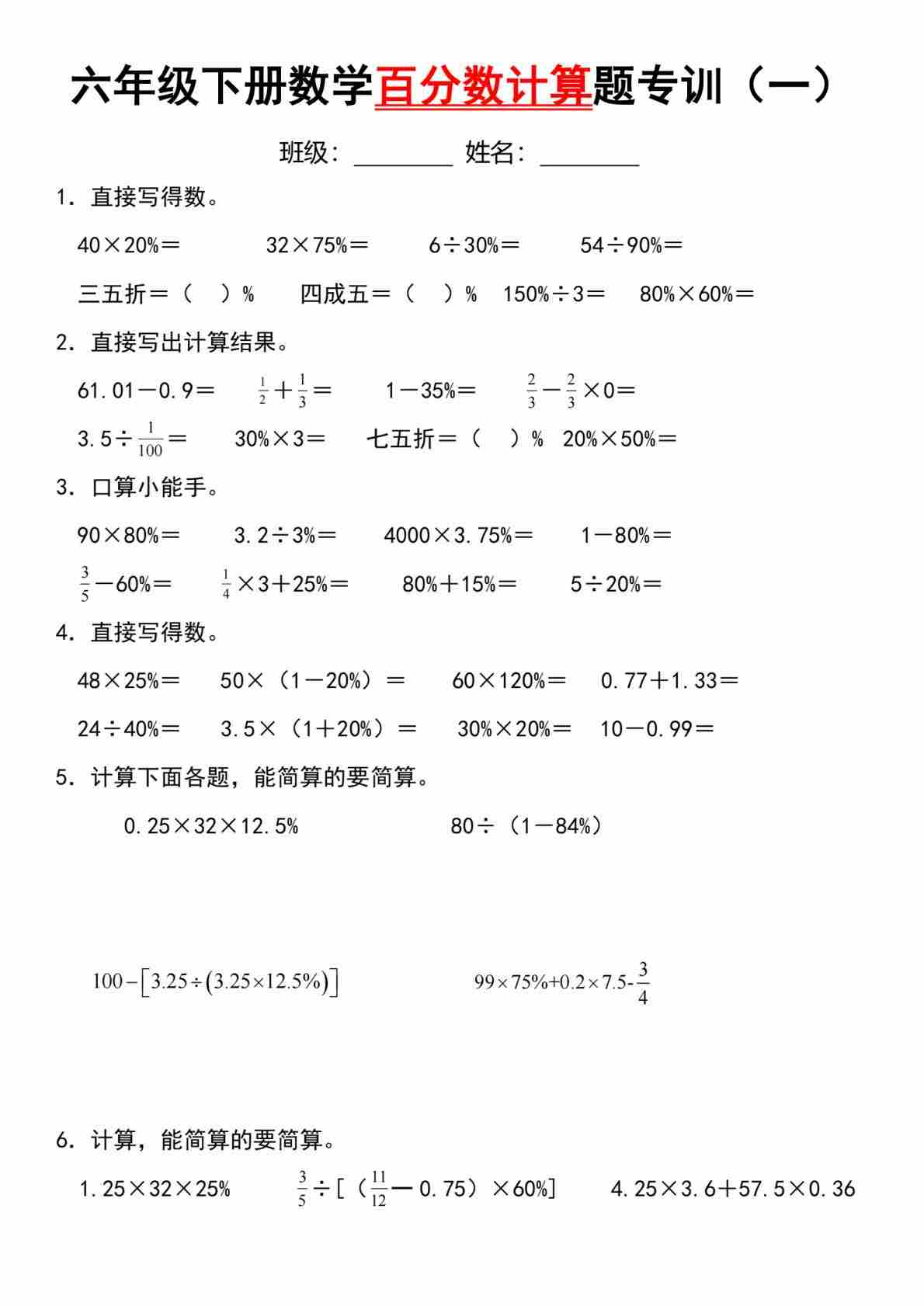 六下人教版数学【计算题-第二单元百分数专项(一)】