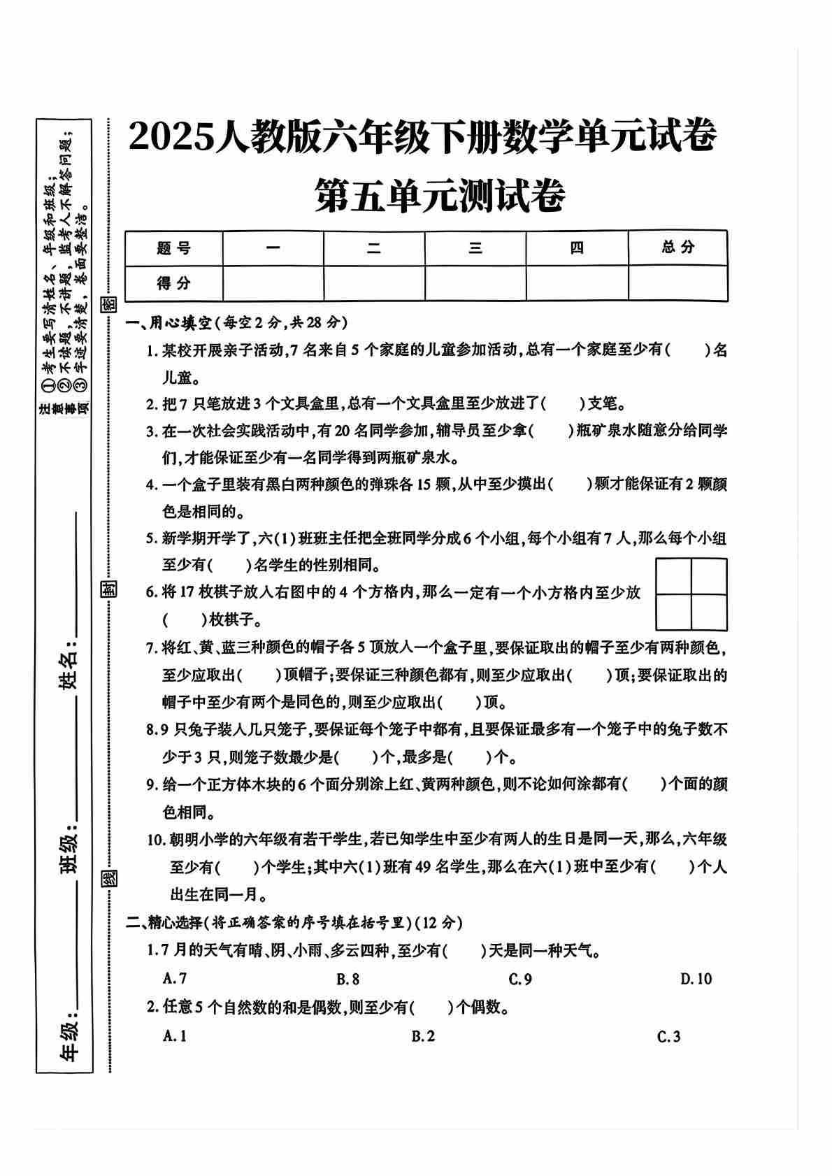 六年级数学下册第五单元数学广角—鸽巢问题检测卷(提高卷)(含答案)人教版