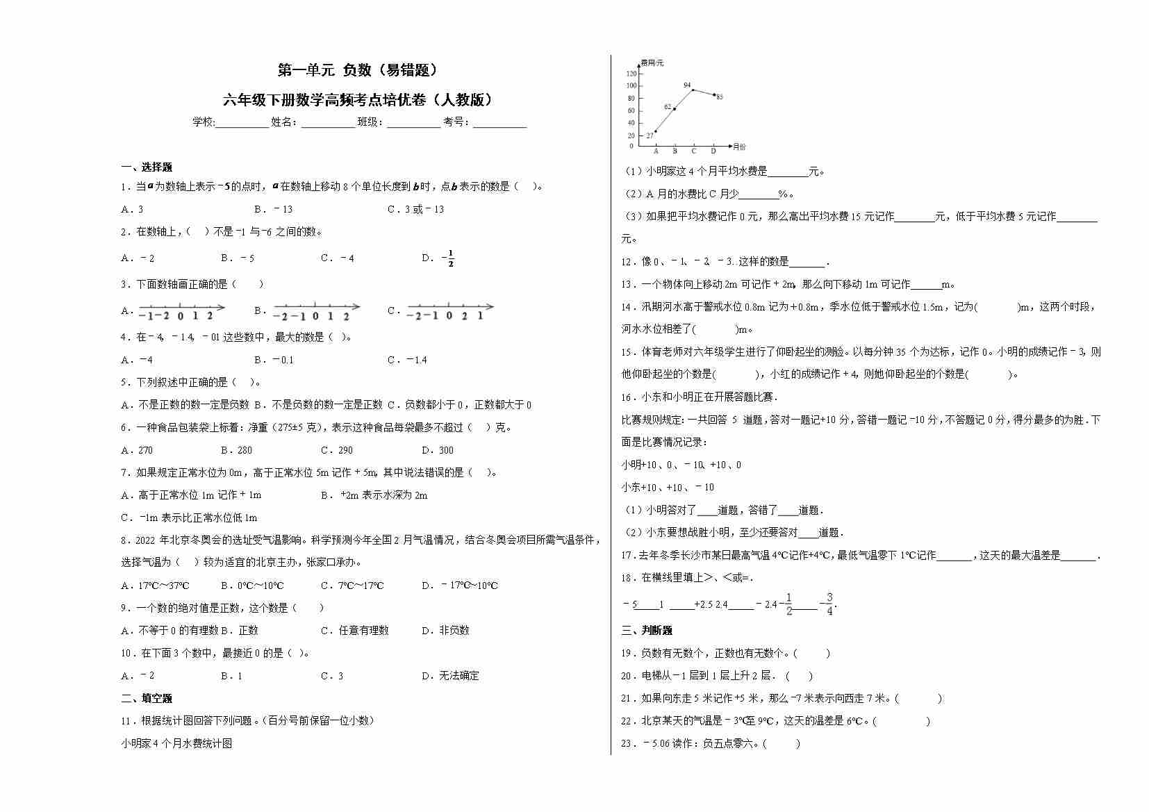 【高频考点易错题】第1单元:负数-六年级下册数学培优卷(人教版) (2)