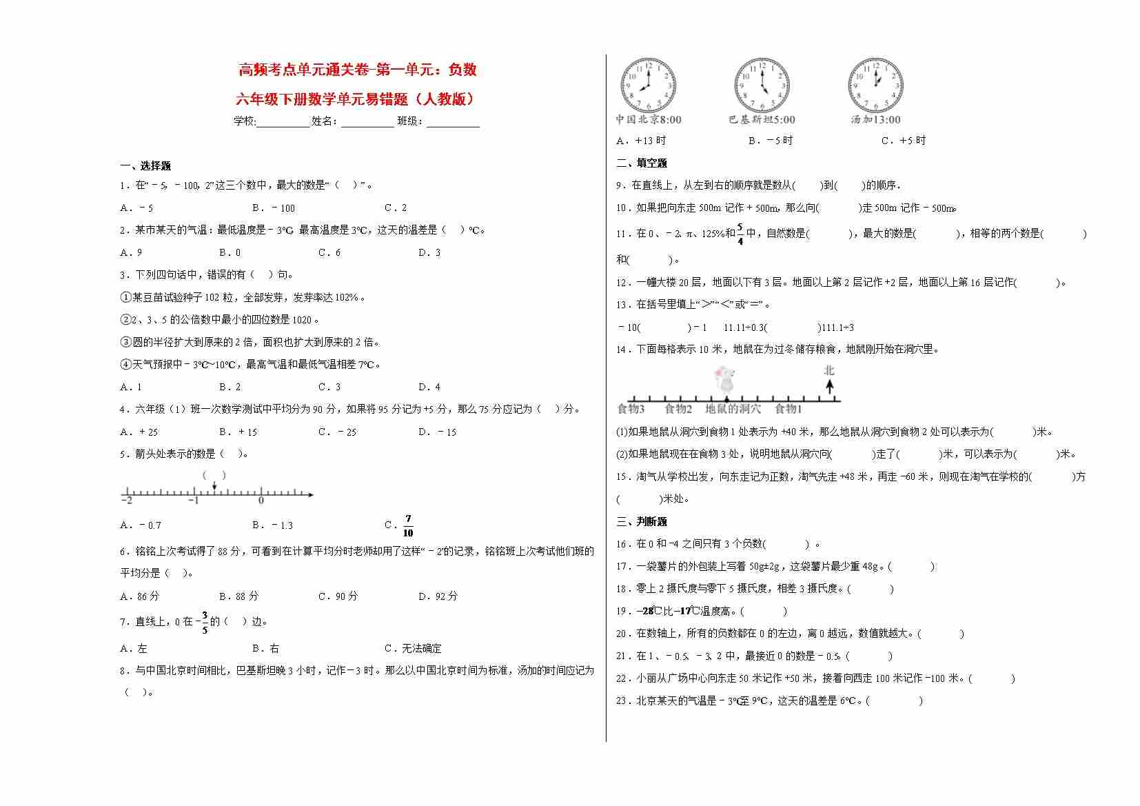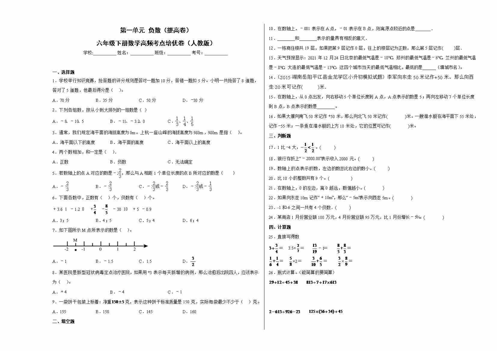 【高频考点易错题】第1单元:负数-六年级下册数学培优卷(人教版) (1)