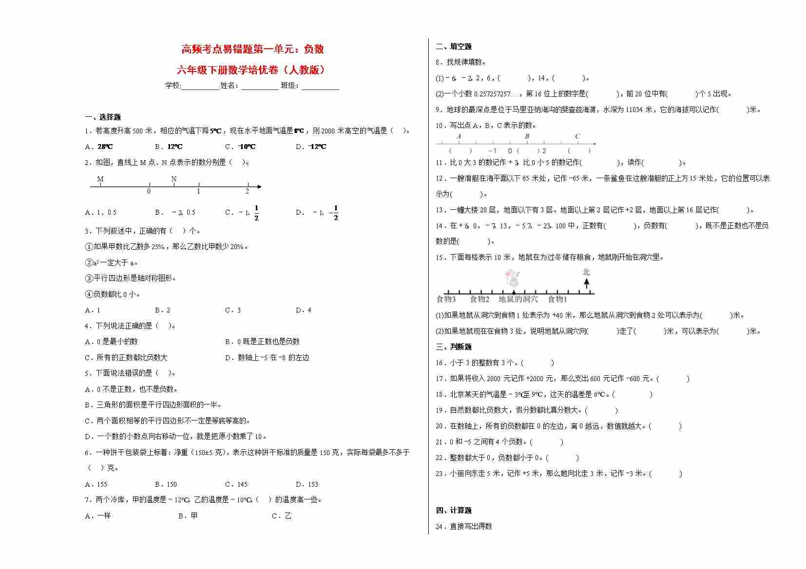 【高频考点易错题】第1单元:负数-六年级下册数学培优卷(人教版) (4)