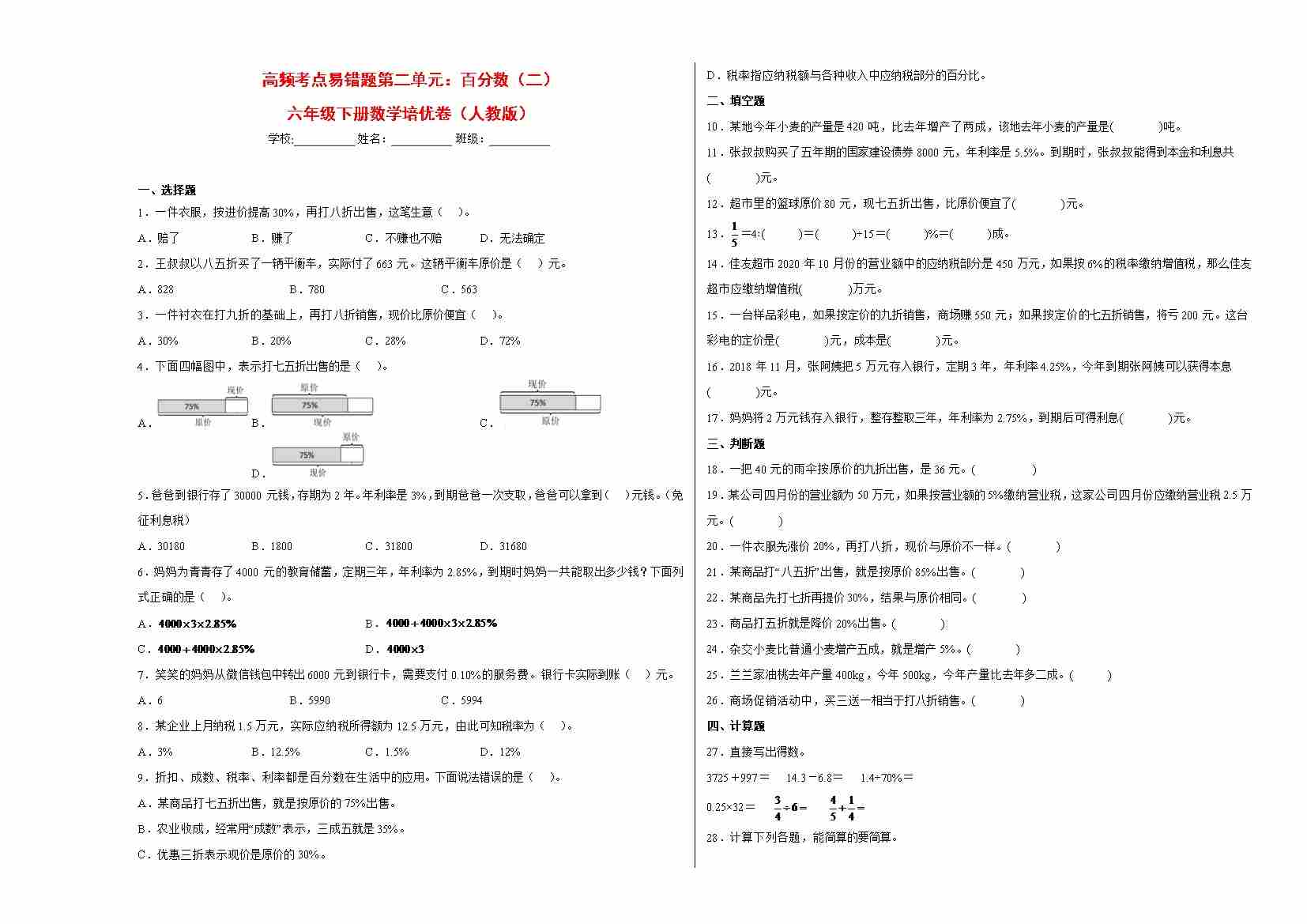 【高频考点易错题】第2单元:百分数-六年级下册数学培优卷(人教版) (4)