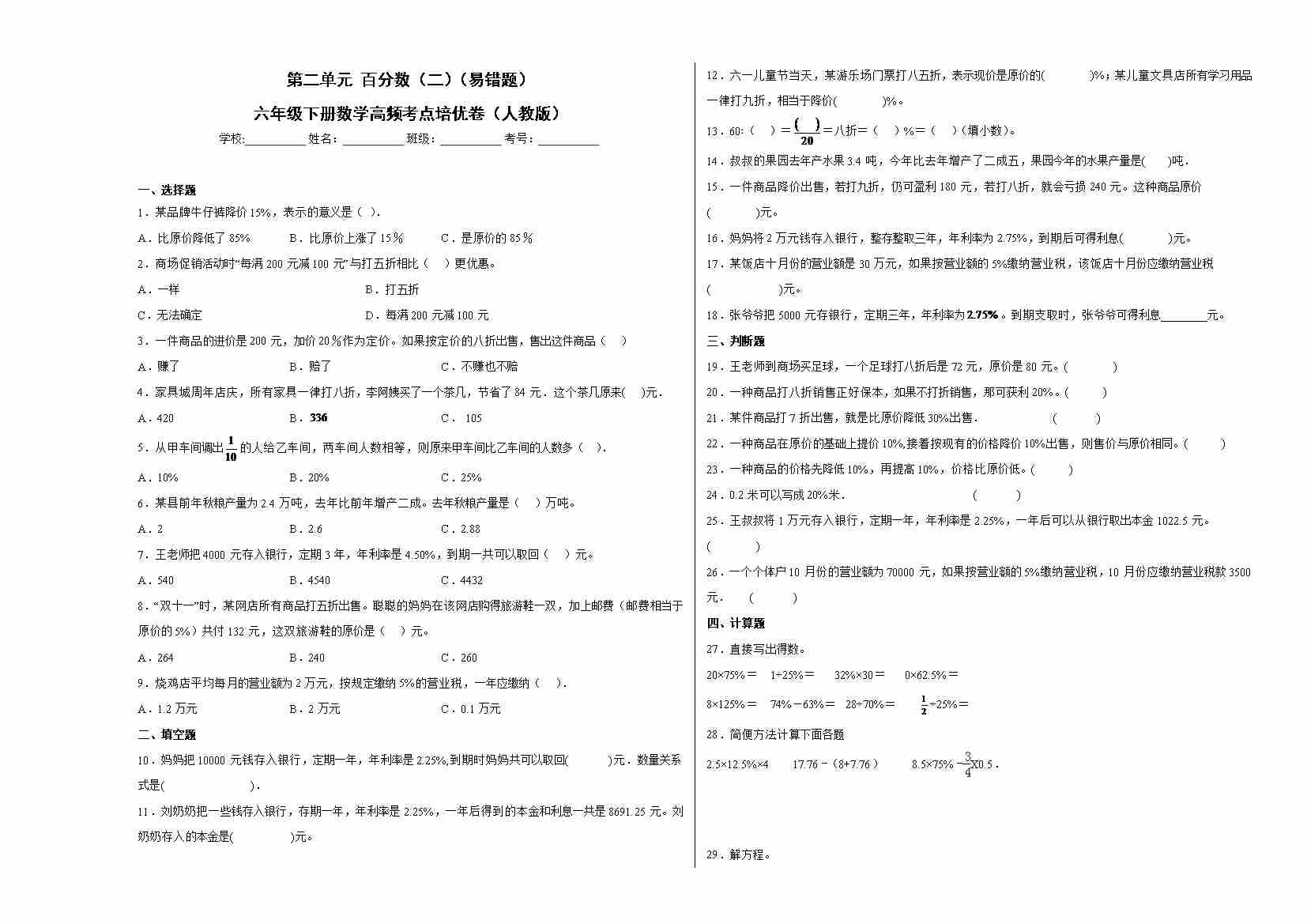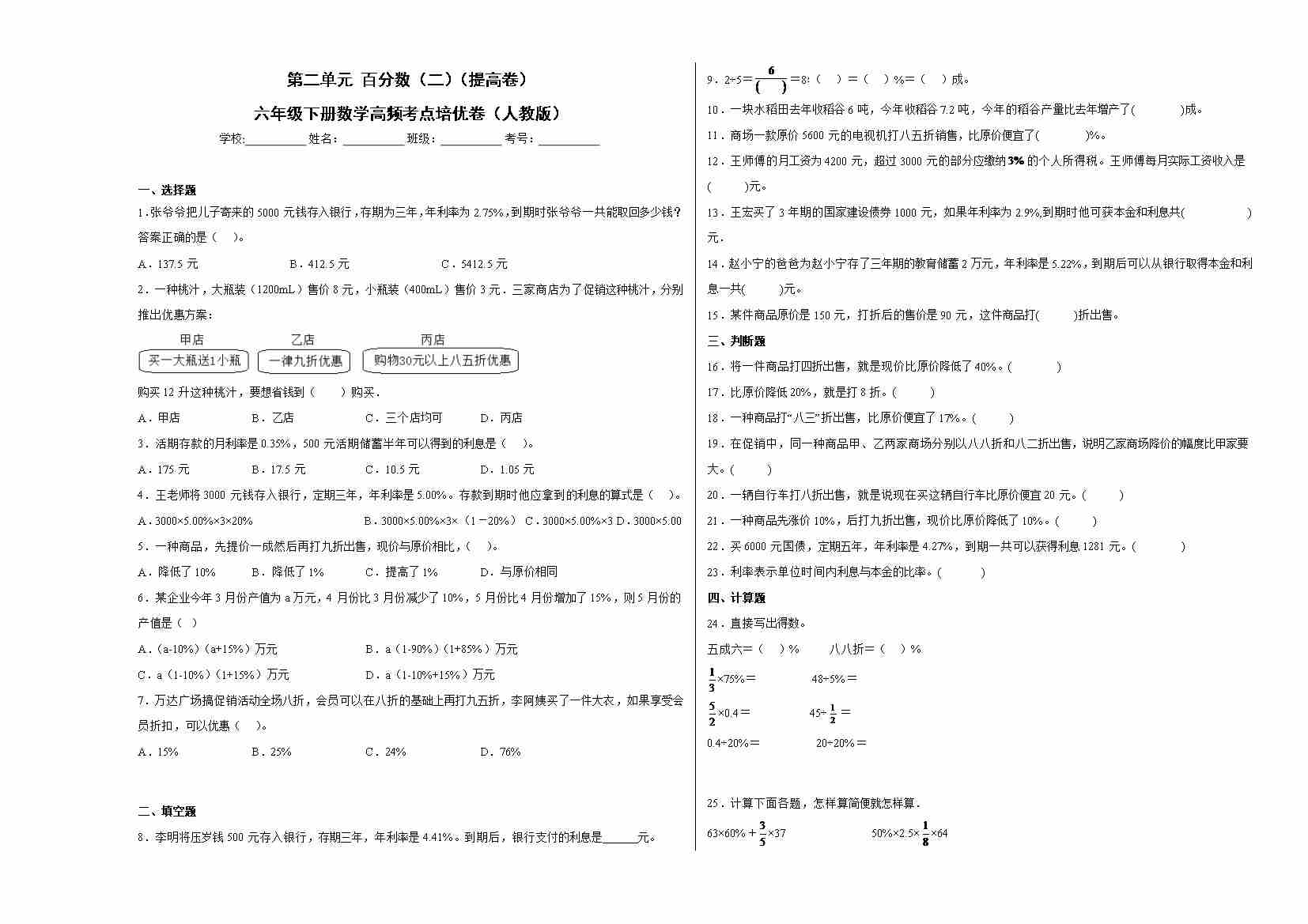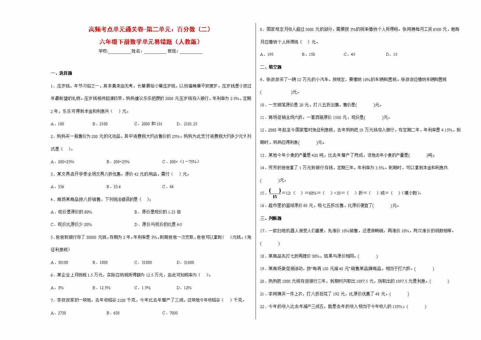 【高频考点易错题】第2单元:百分数-六年级下册数学培优卷(人教版) (1)