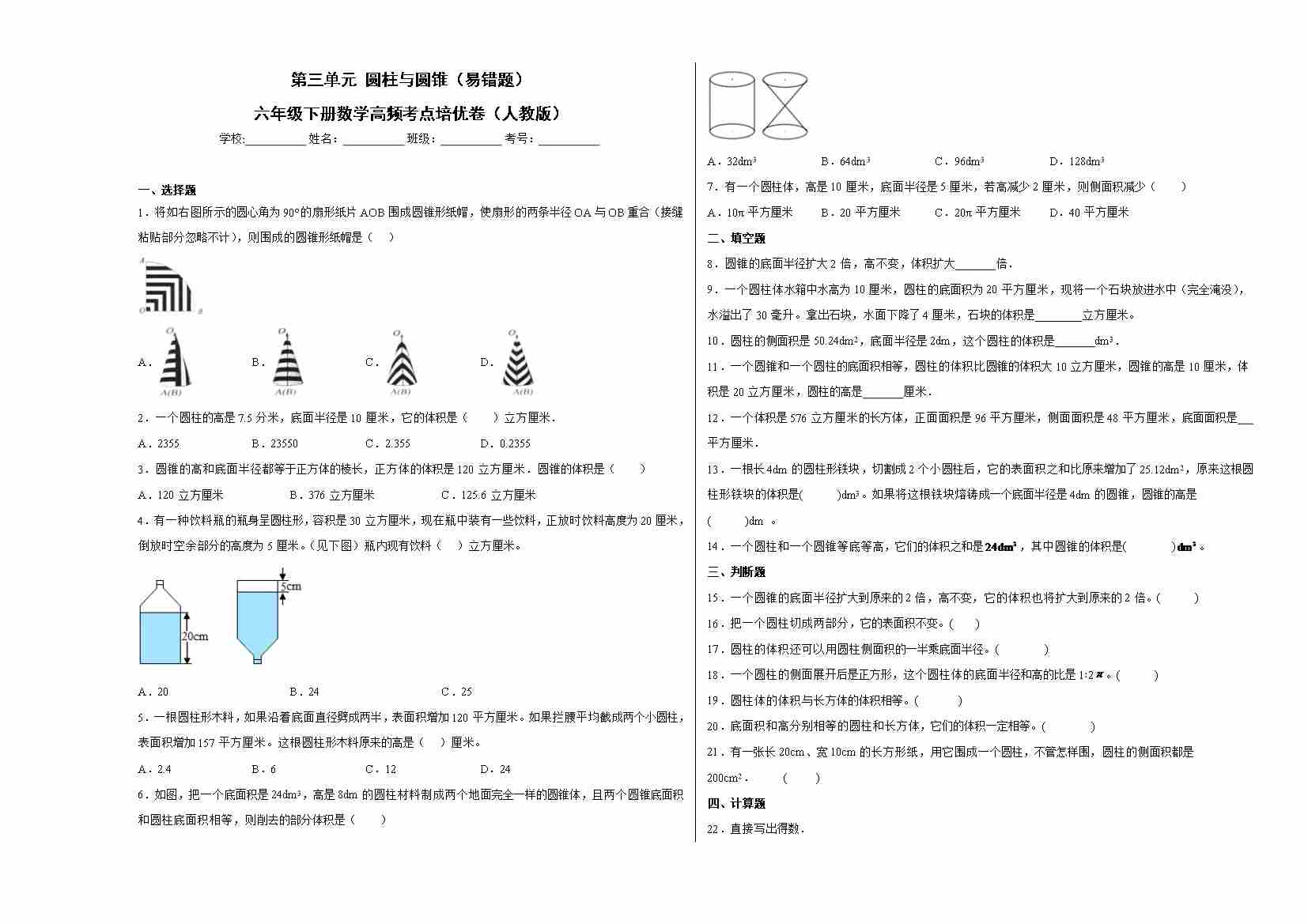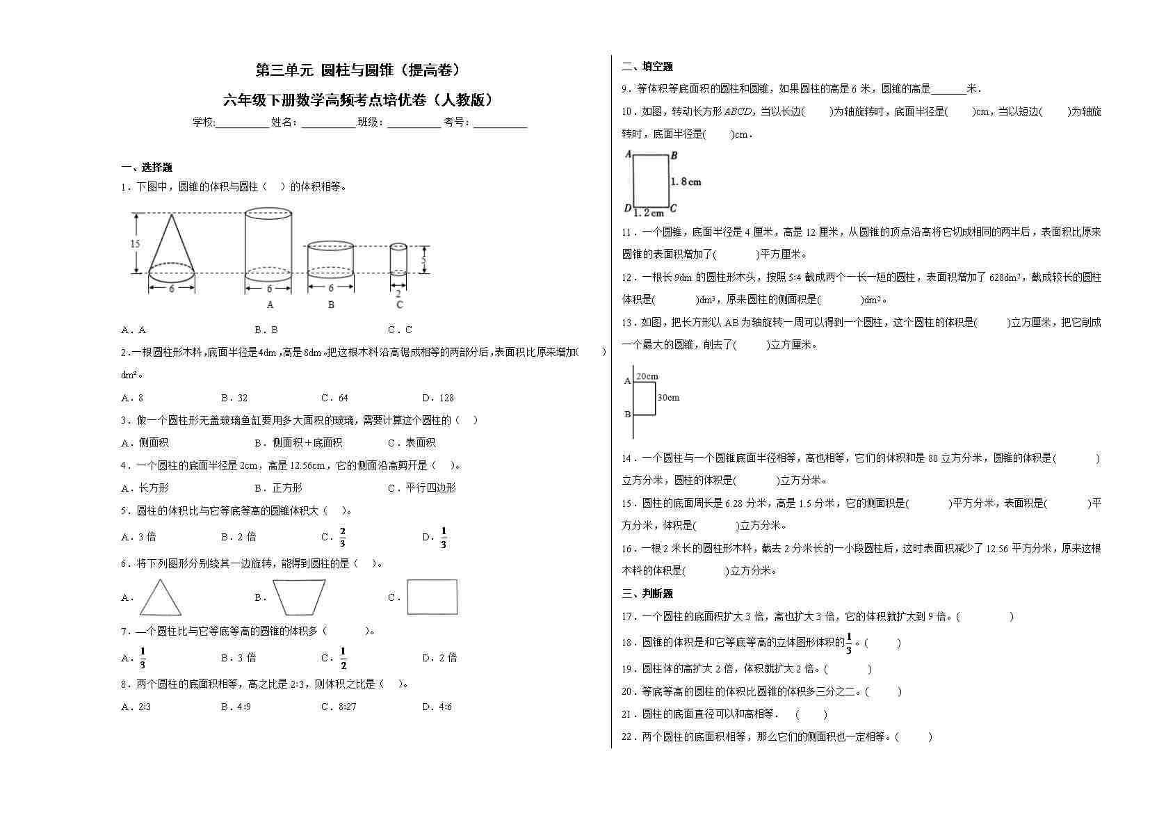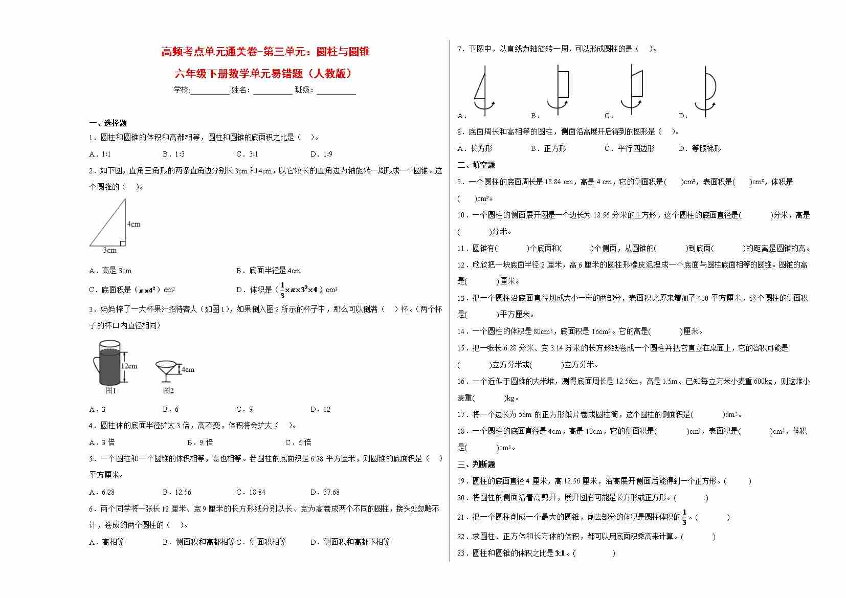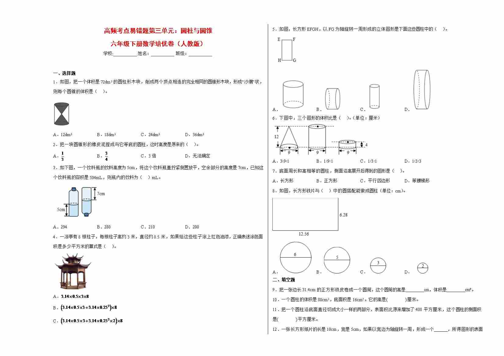 【高频考点易错题】第3单元:圆柱与圆锥-六年级下册数学培优卷(人教版) (1)