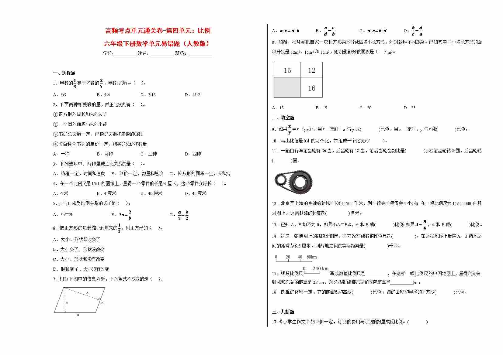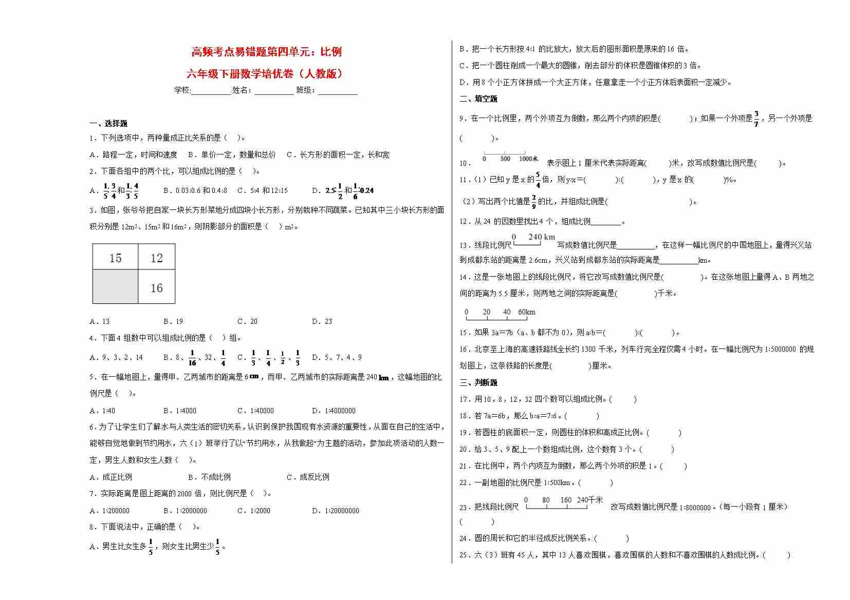 【高频考点易错题】第4单元:比例-六年级下册数学培优卷(人教版) (1)