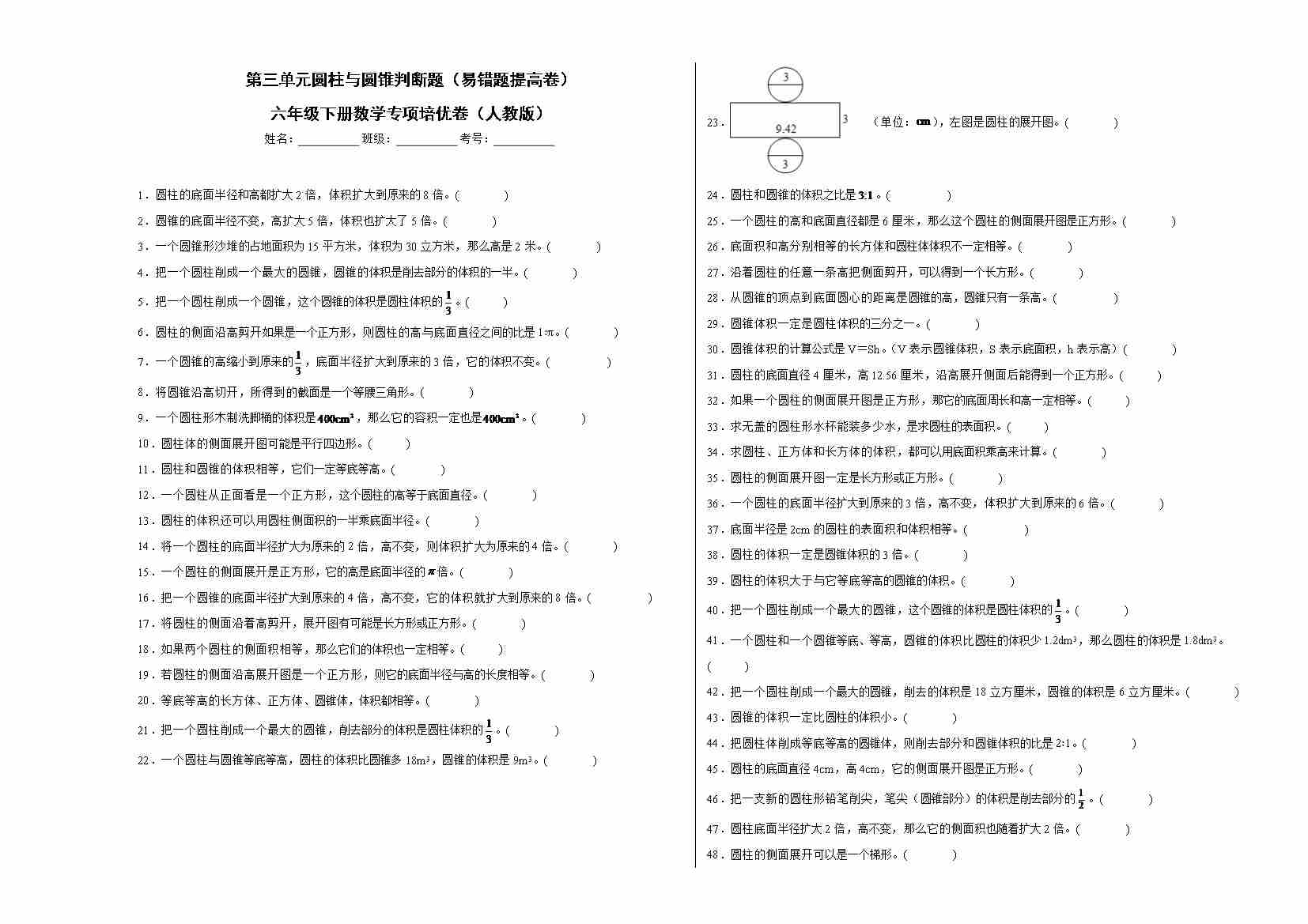 【高频考点易错题】第3单元:圆柱与圆锥-六年级下册数学培优卷(人教版) (3)