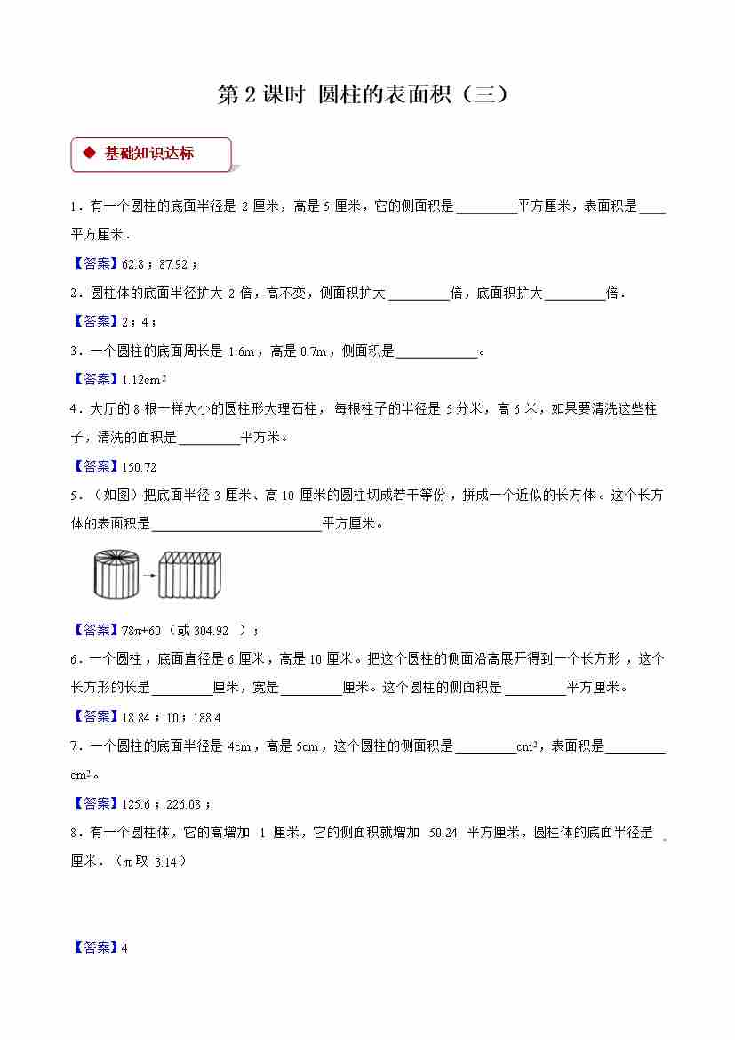 【一课一练】小学数学六年级下册第三单元《圆柱与圆锥)》-第2课时 圆柱的表面积(三) -附答案-人教版