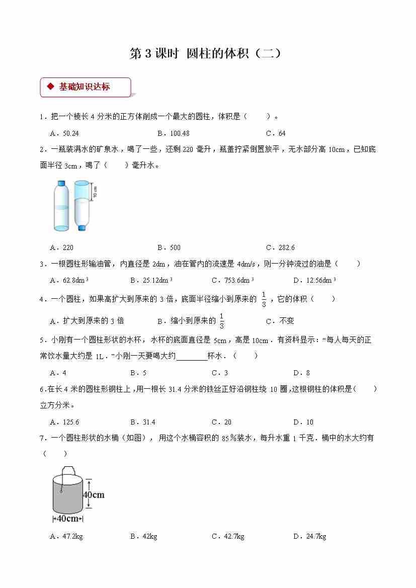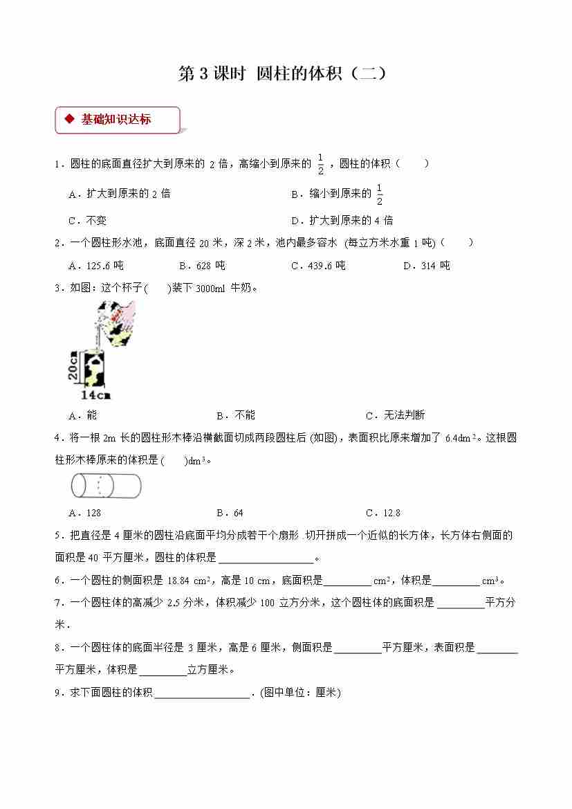【一课一练】小学数学六年级下册第三单元《圆柱与圆锥)》-第3课时 圆柱的体积(二) -附答案-人教版