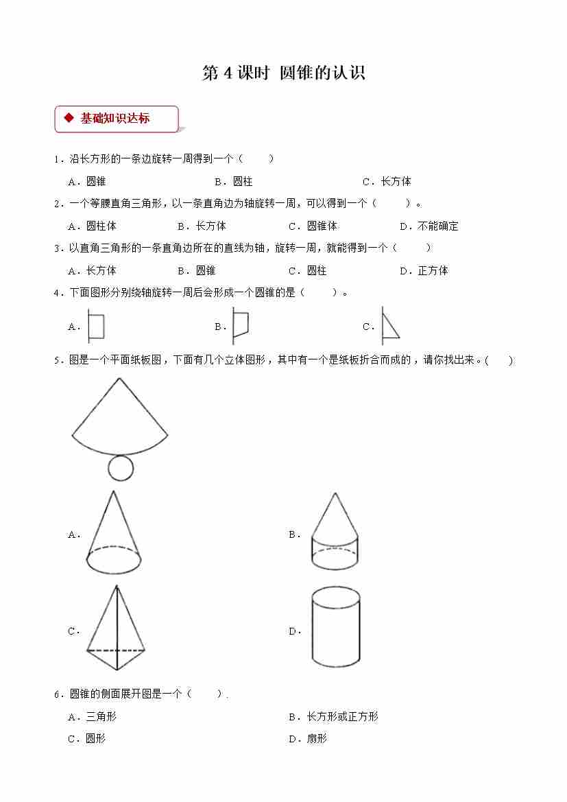 【一课一练】小学数学六年级下册第三单元《圆柱与圆锥)》-第4课时 圆锥的认识 -附答案-人教版