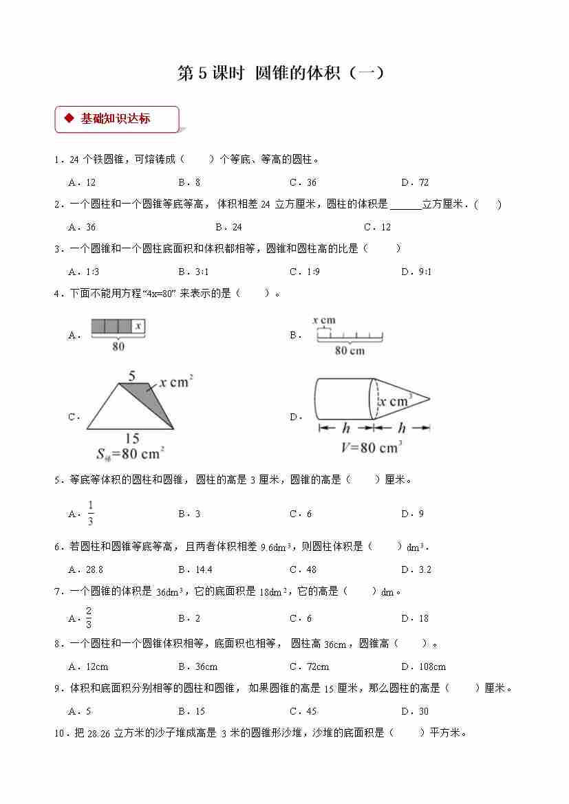 【一课一练】小学数学六年级下册第三单元《圆柱与圆锥)》-第5课时 圆锥的体积(一) -附答案-人教版