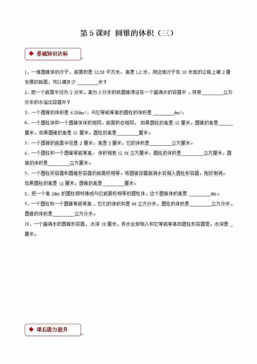 【一课一练】小学数学六年级下册第三单元《圆柱与圆锥)》-第5课时 圆锥的体积(三) -附答案-人教版