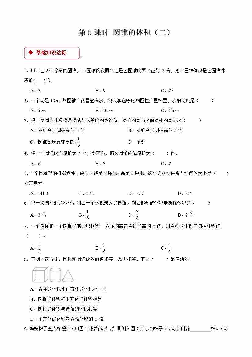 【一课一练】小学数学六年级下册第三单元《圆柱与圆锥)》-第5课时 圆锥的体积(二) -附答案-人教版