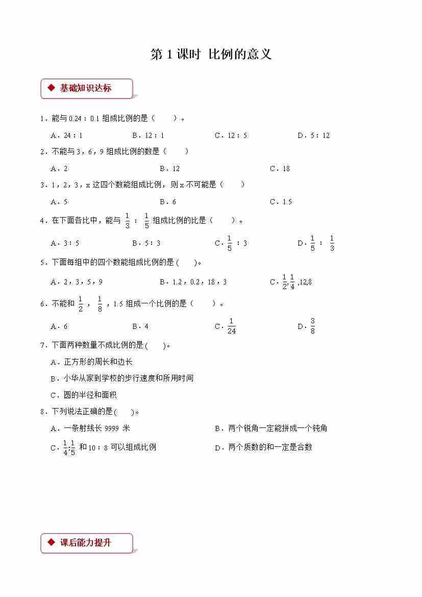 【一课一练】小学数学六年级下册第四单元《比例)》-第1课时 比例的意义 -附答案-人教版