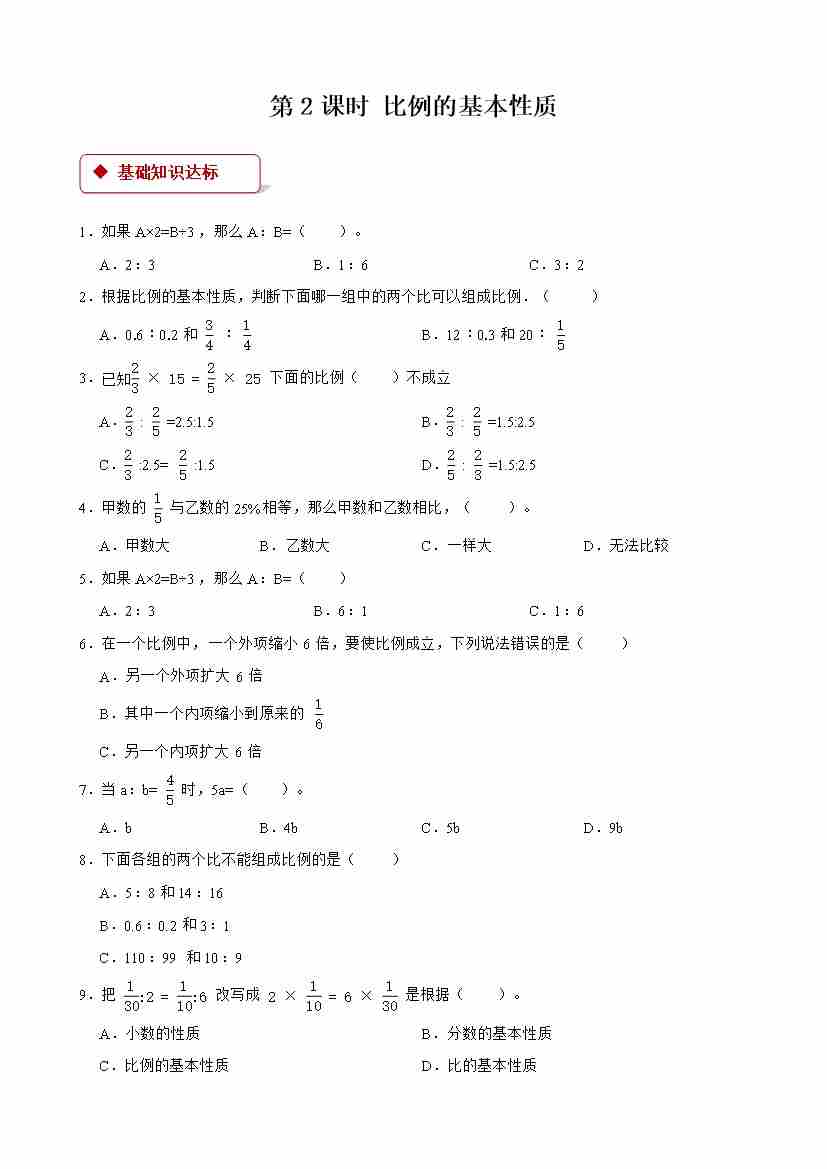 【一课一练】小学数学六年级下册第四单元《比例)》-第2课时 比例的基本性质 -附答案-人教版