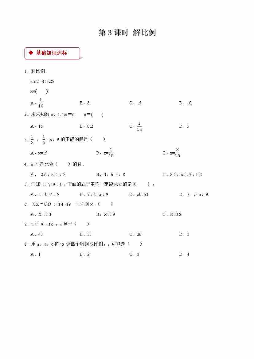 【一课一练】小学数学六年级下册第四单元《比例)》-第3课时 解比例 -附答案-人教版