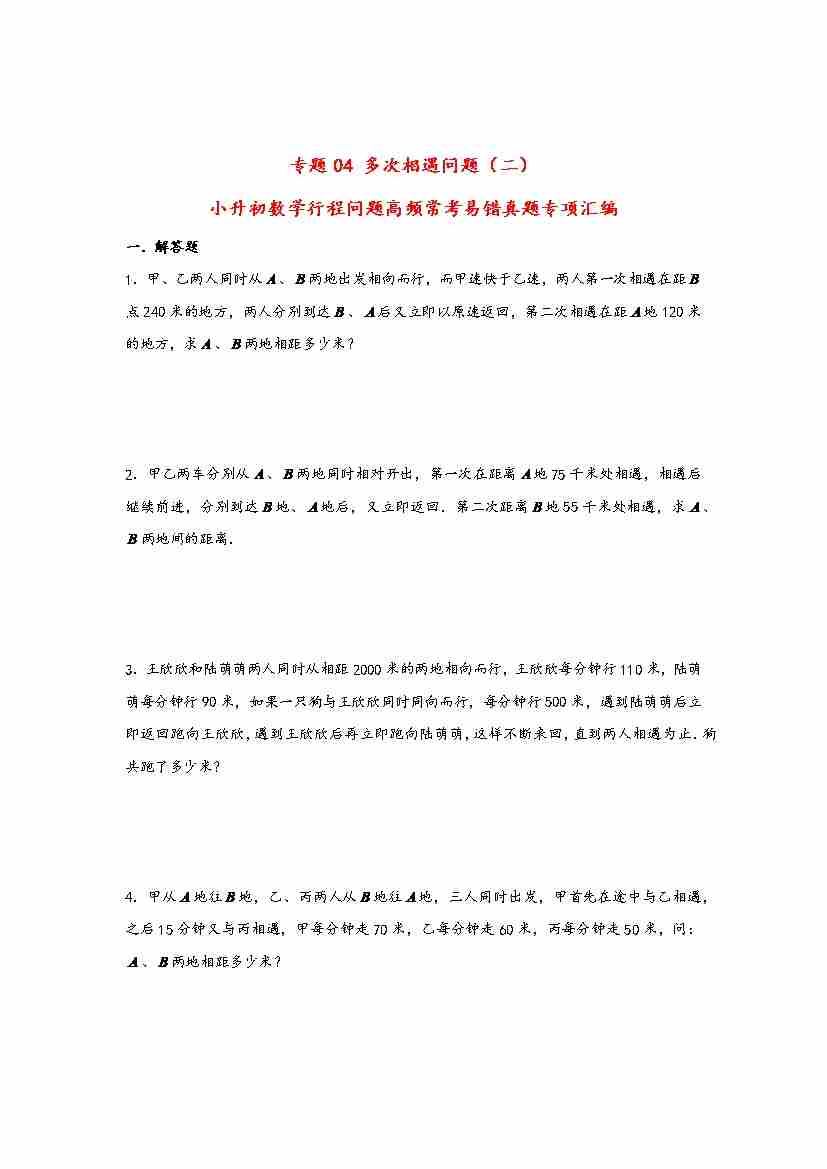 【行程问题】小升初数学高频常考易错真题汇编:专题04 多次相遇问题(二)