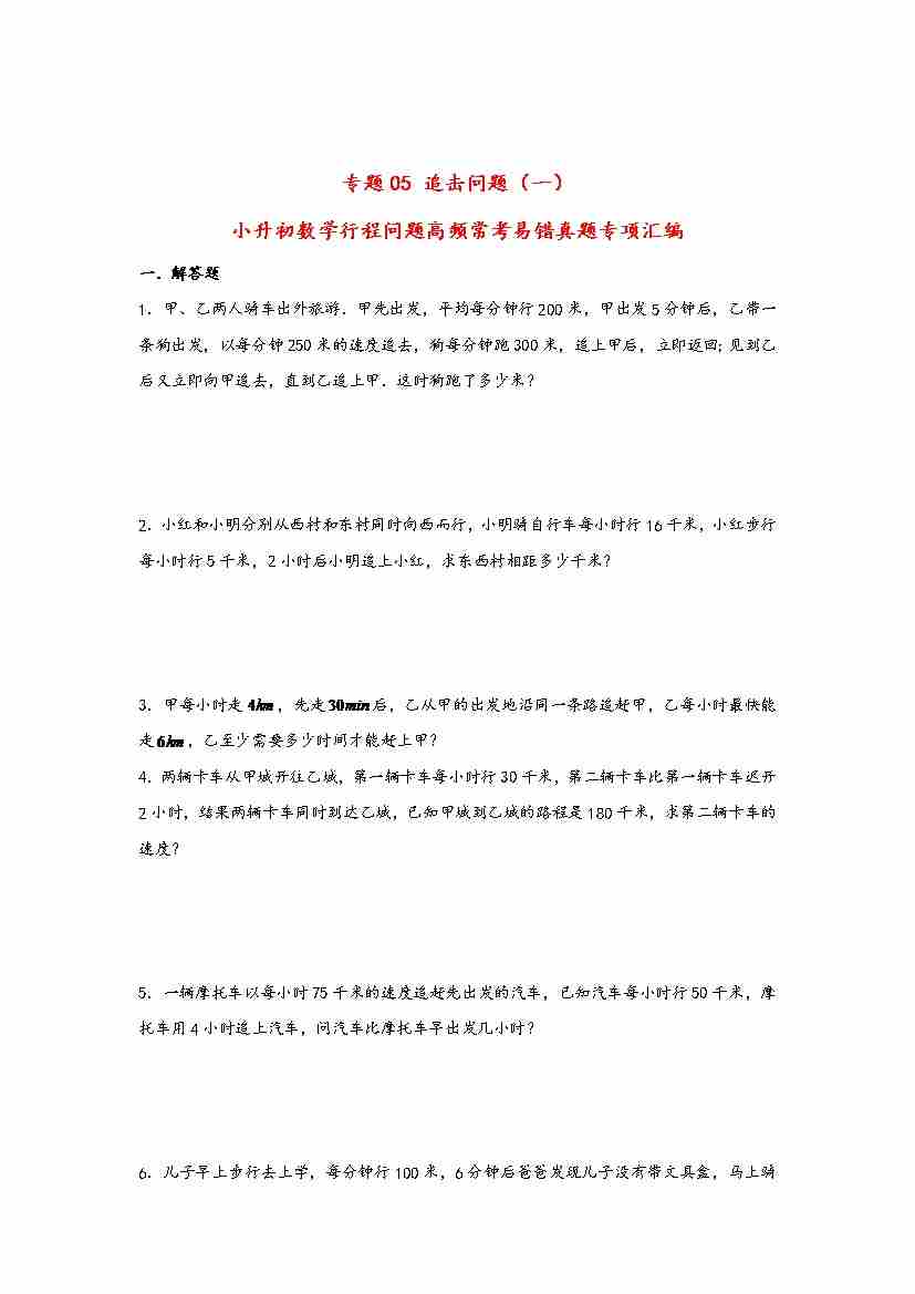 【行程问题】小升初数学高频常考易错真题汇编:专题05 追击问题(一)