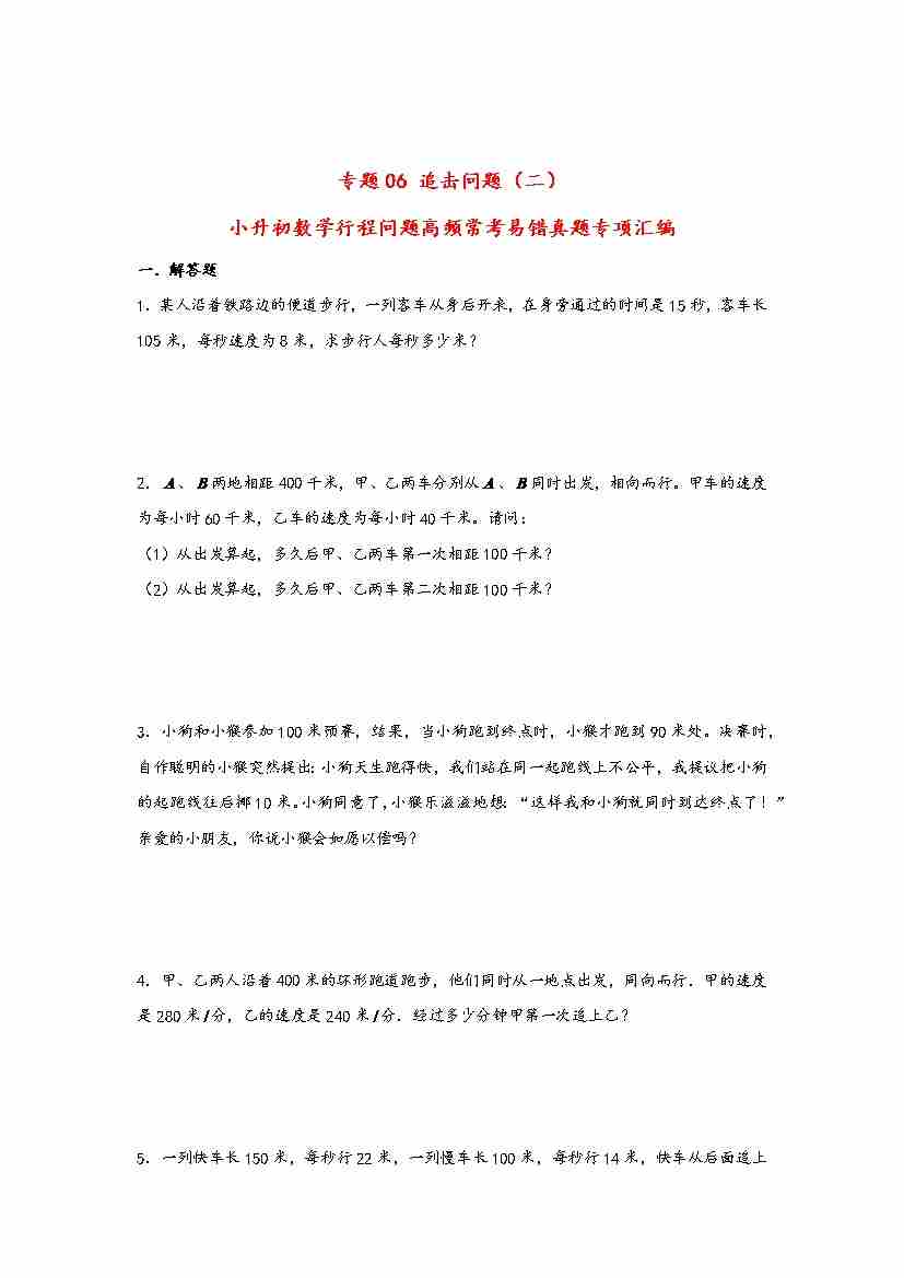 【行程问题】小升初数学高频常考易错真题汇编:专题06 追击问题(二)