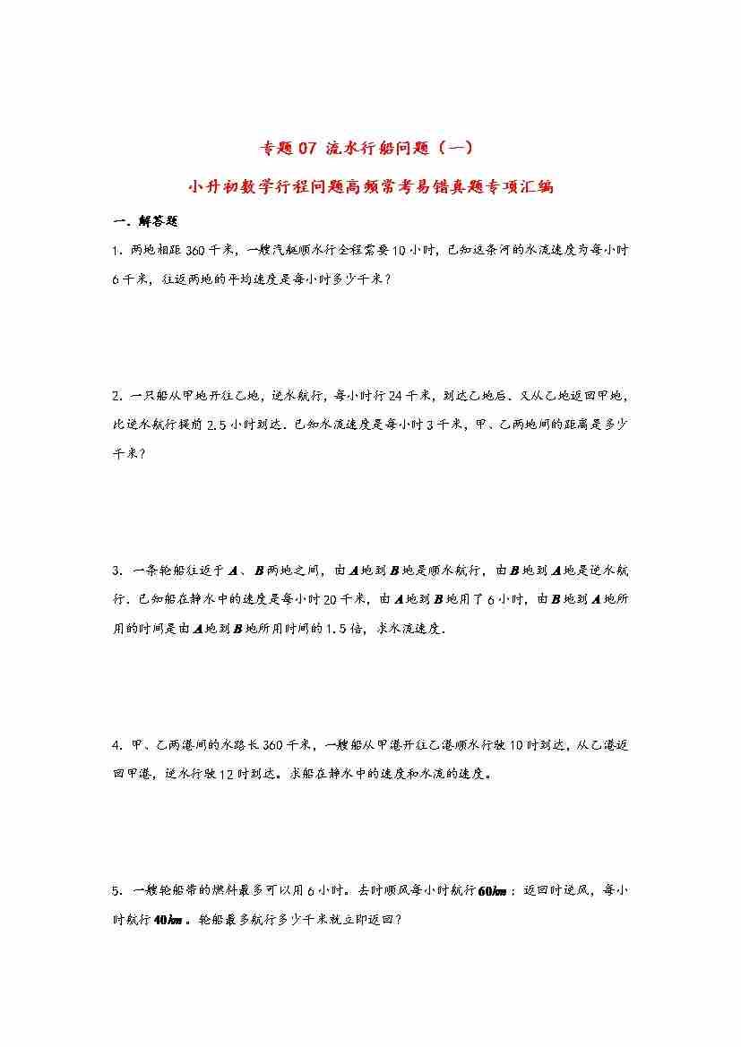 【行程问题】小升初数学高频常考易错真题汇编:专题07 流水行船问题(一)