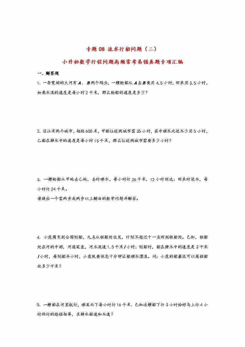 【行程问题】小升初数学高频常考易错真题汇编:专题08 流水行船问题(二)