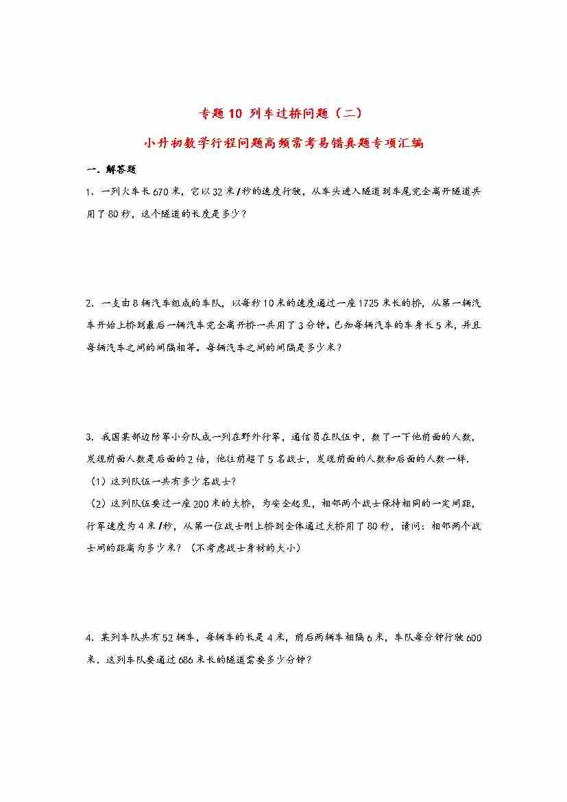 【行程问题】小升初数学高频常考易错真题汇编:专题10 列车过桥问题(二)
