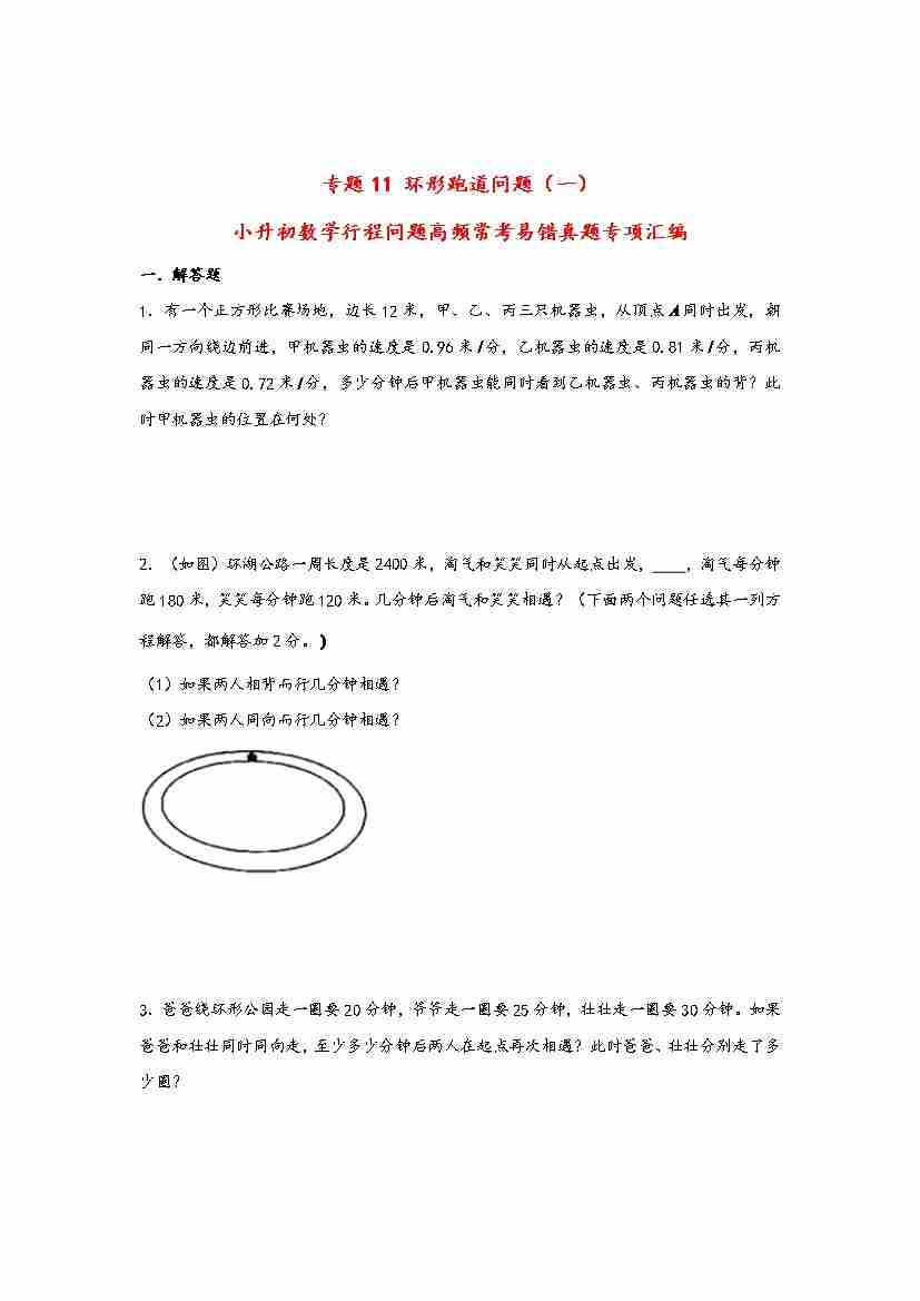 【行程问题】小升初数学高频常考易错真题汇编:专题11 环形跑道问题(一)
