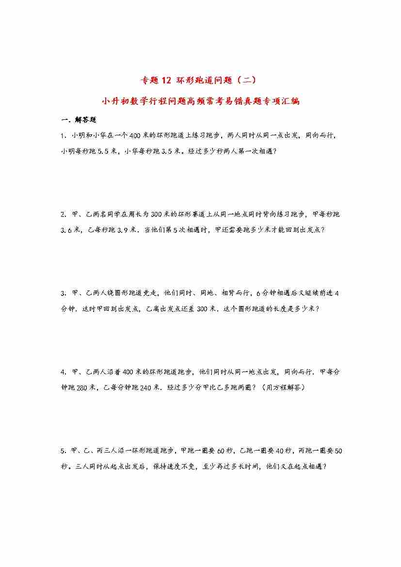 【行程问题】小升初数学高频常考易错真题汇编:专题12 环形跑道问题(二)