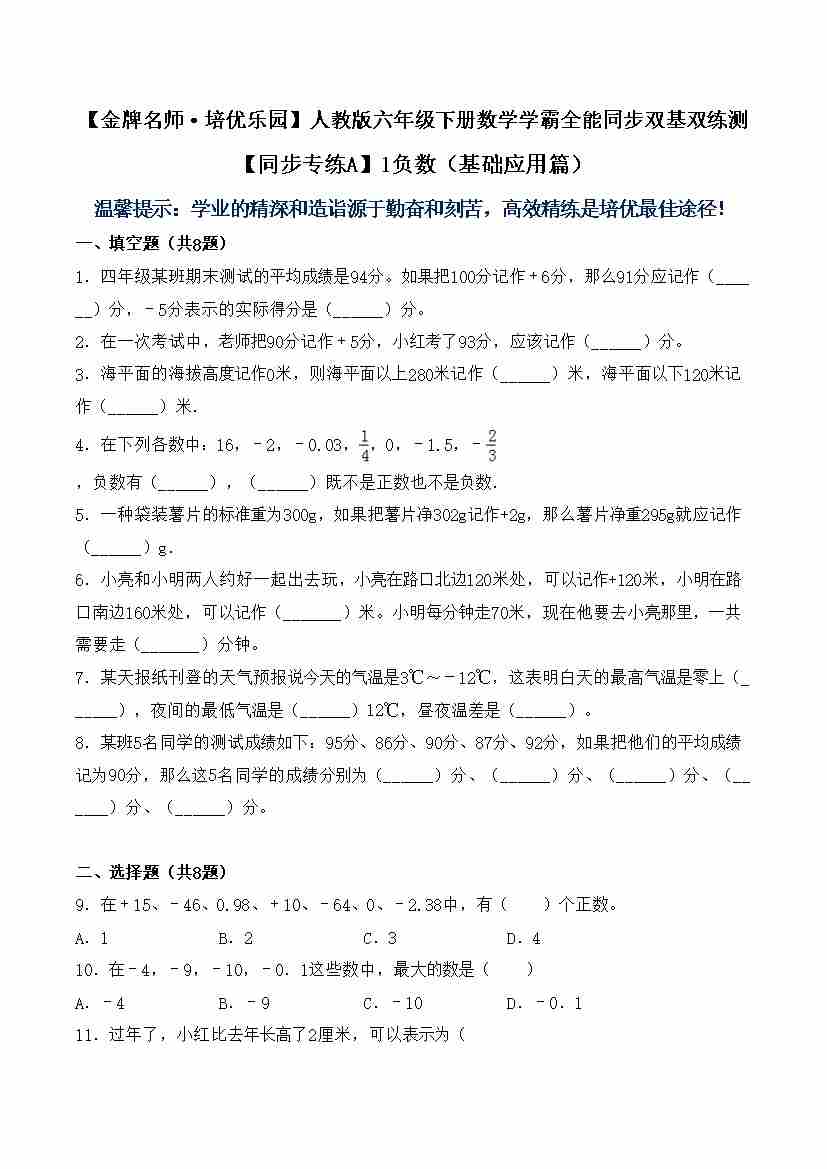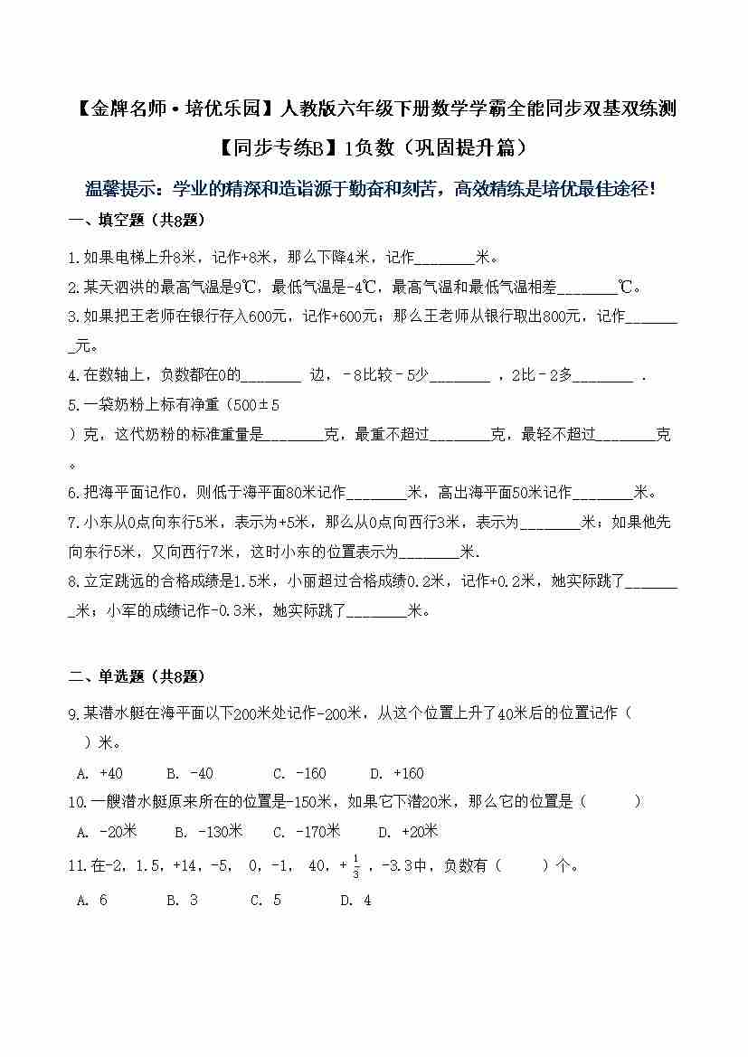 【提升能力】1.1负数(基础应用篇)六年级下册数学学霸全能同步双基双练测 人教版(含答案)