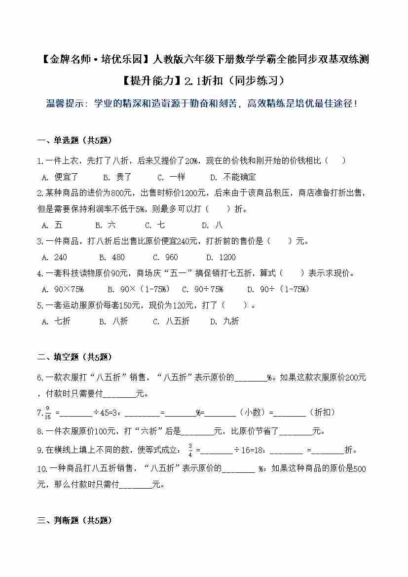 【提升能力】2.1 折扣(同步练习)六年级下册数学学霸全能同步双基双练测 人教版(含答案)