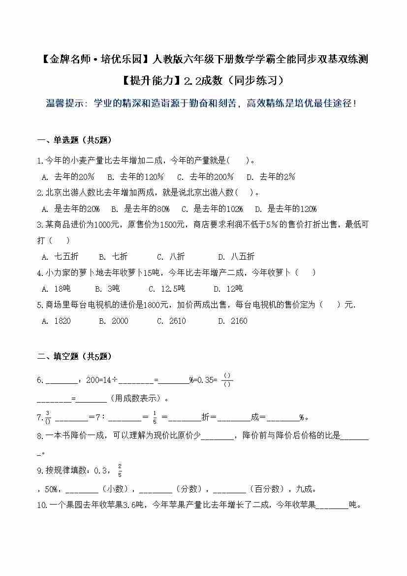 【提升能力】2.2 成数(同步练习)六年级下册数学学霸全能同步双基双练测 人教版(含答案)