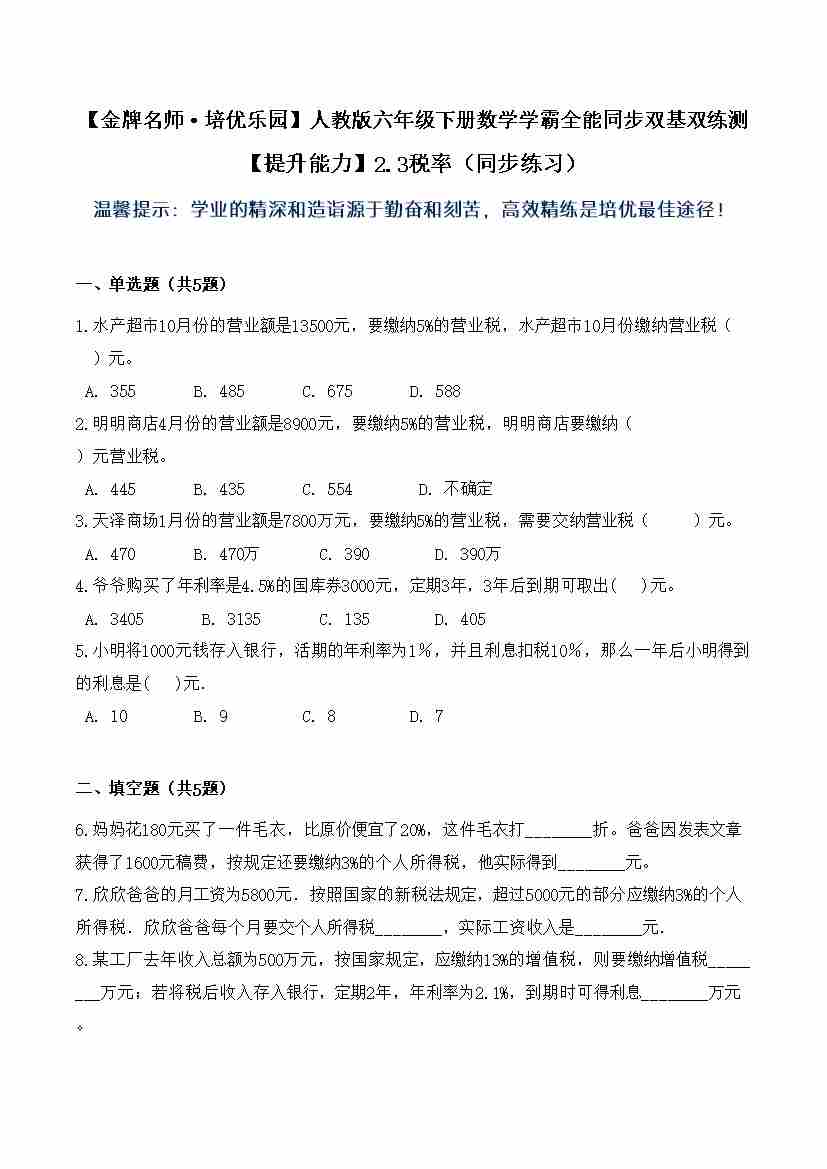 【提升能力】2.3 税率(同步练习)六年级下册数学学霸全能同步双基双练测 人教版(含答案)