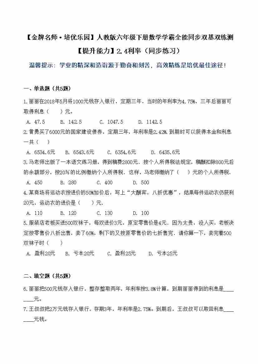【提升能力】2.4 利率(同步练习)六年级下册数学学霸全能同步双基双练测 人教版(含答案)
