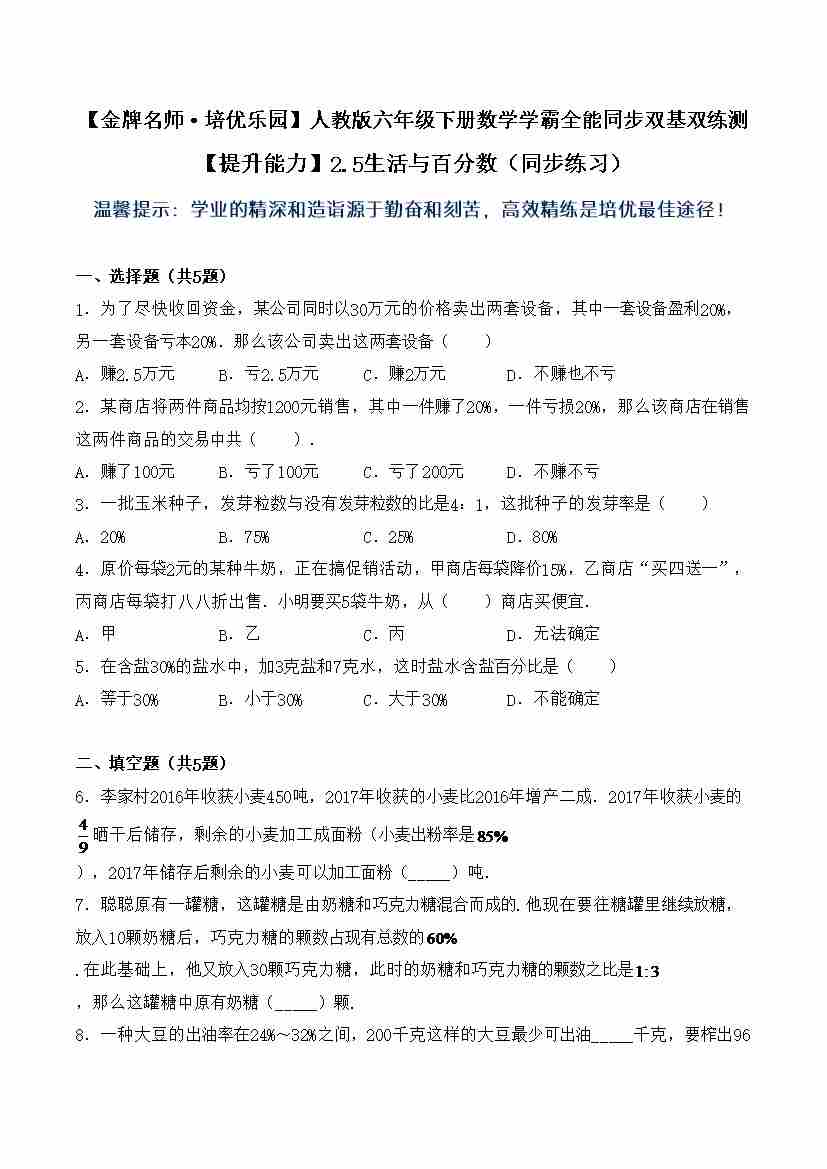 【提升能力】2.5 生活与百分数(同步练习)六年级下册数学学霸全能同步双基双练测 人教版(含答案)