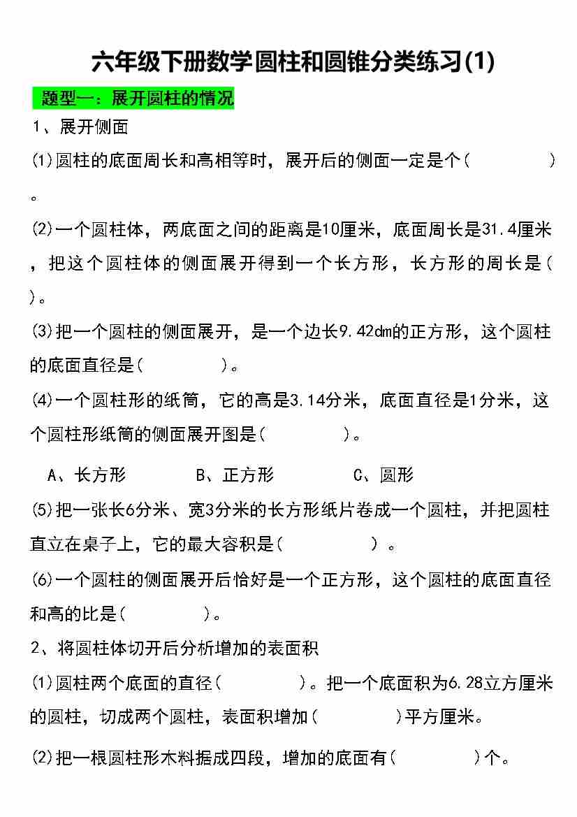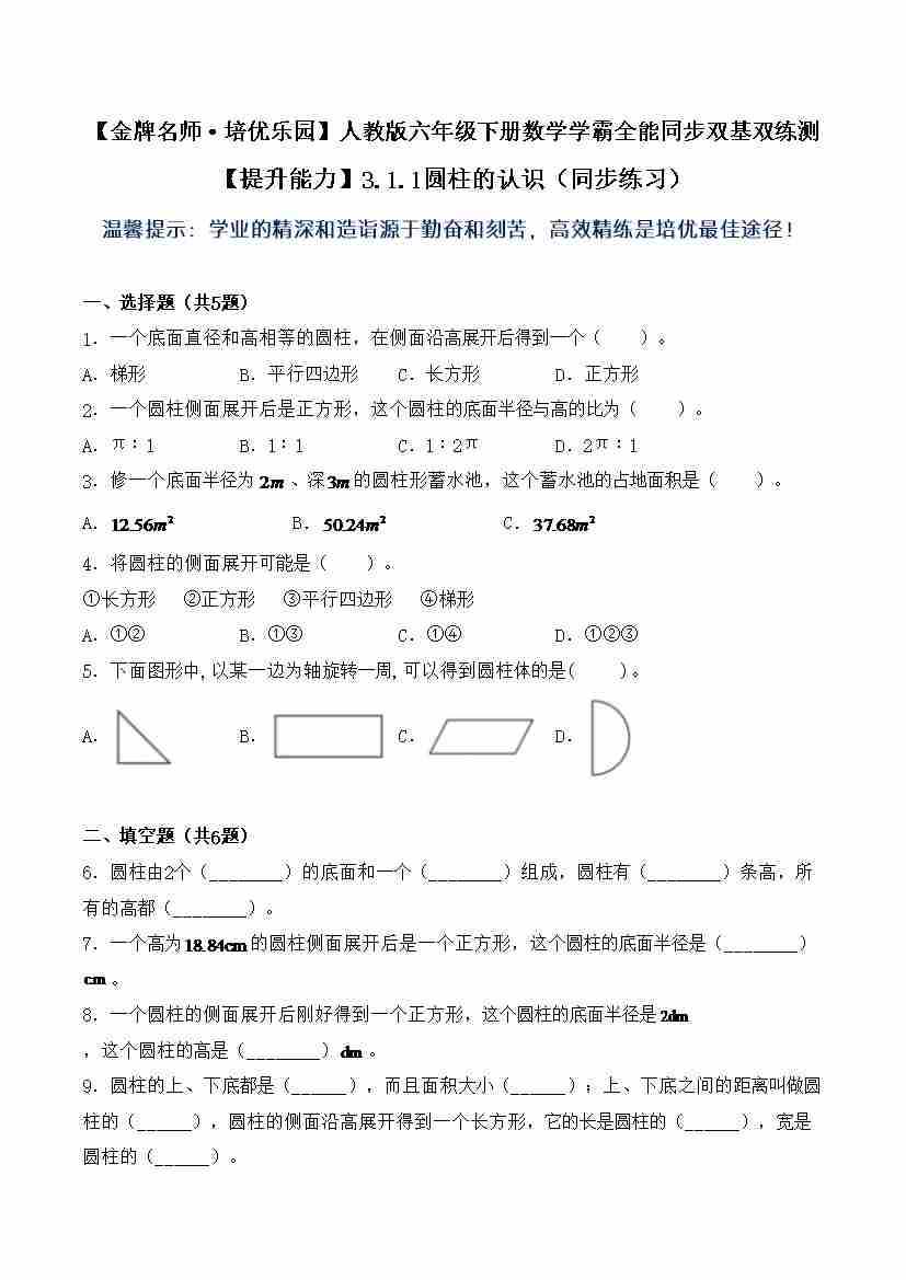 【提升能力】3.1.1 圆柱的认识(同步练习)六年级下册数学学霸全能同步双基双练测 人教版(含答案)