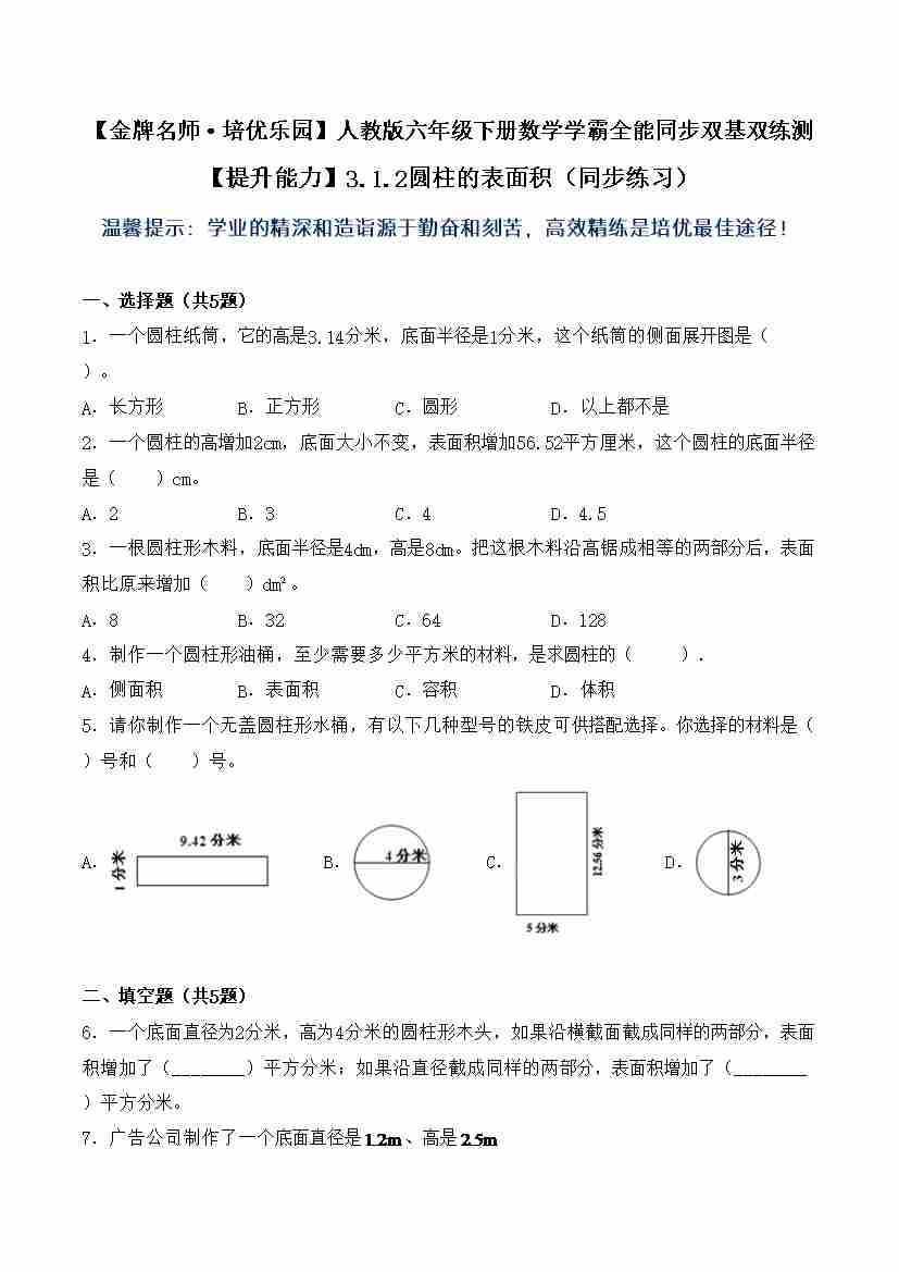 【提升能力】3.1.2 圆柱的表面积(同步练习)六年级下册数学学霸全能同步双基双练测 人教版(含答案)