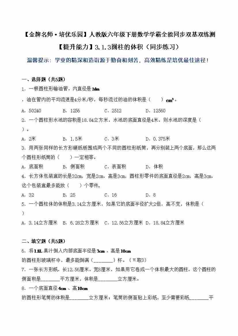 【提升能力】3.1.3 圆柱的体积(同步练习)六年级下册数学学霸全能同步双基双练测 人教版(含答案)