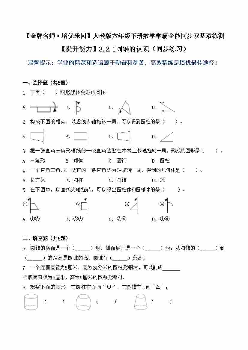 【提升能力】3.2.1 圆锥的认识(同步练习)六年级下册数学学霸全能同步双基双练测 人教版(含答案)