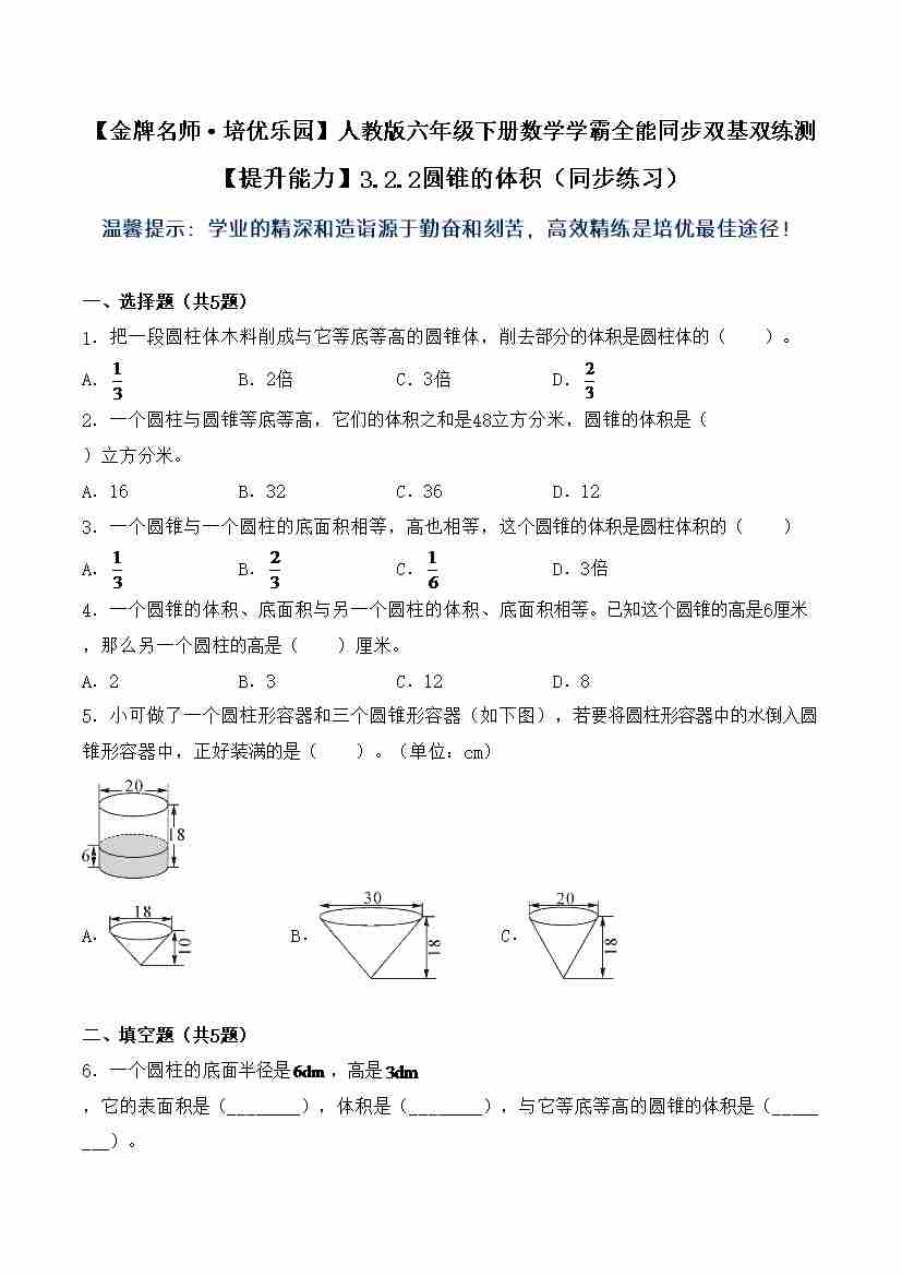 【提升能力】3.2.2 圆锥的体积(同步练习)六年级下册数学学霸全能同步双基双练测 人教版(含答案)