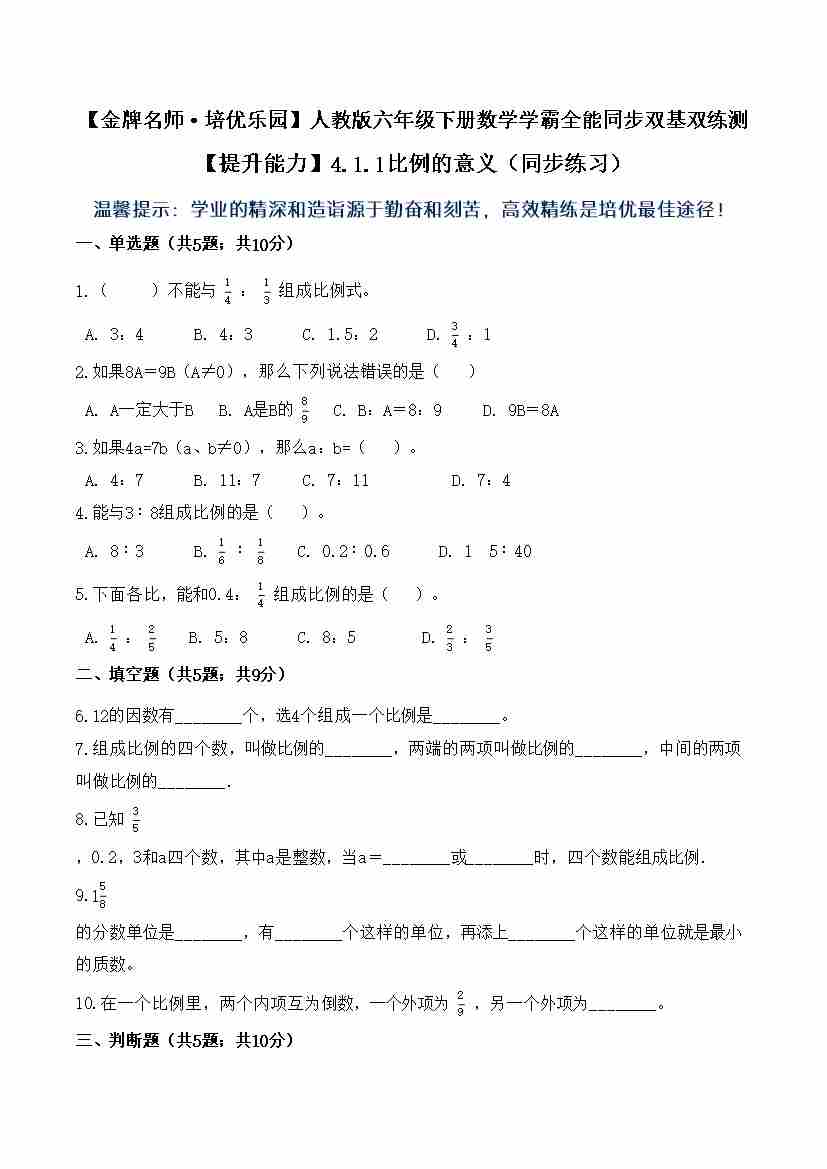 【提升能力】4.1.1比例的意义(同步练习)六年级下册数学学霸全能同步双基双练测 人教版(含答案)